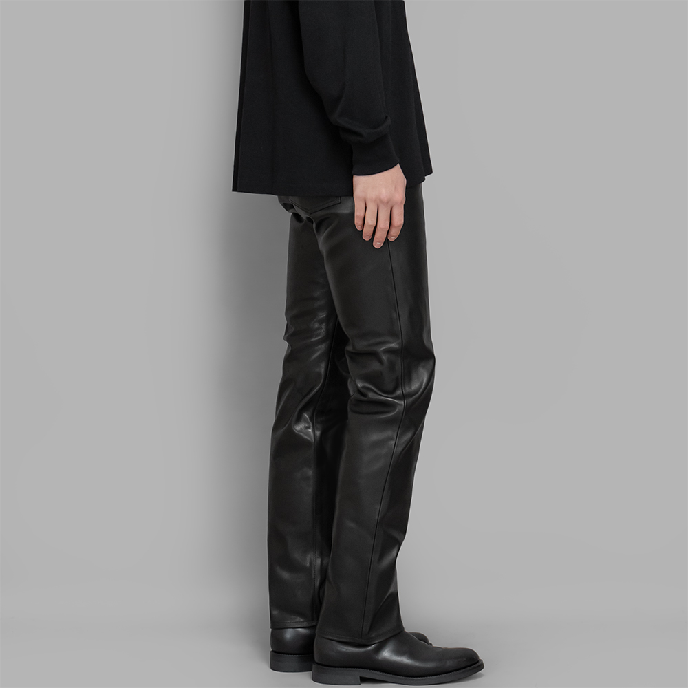しっかりした質感のホースレザーを使用しています。型は、細身のシルエットの5Pパンツで、前立てはジップフライ、中は半裏の仕様で作られています。
