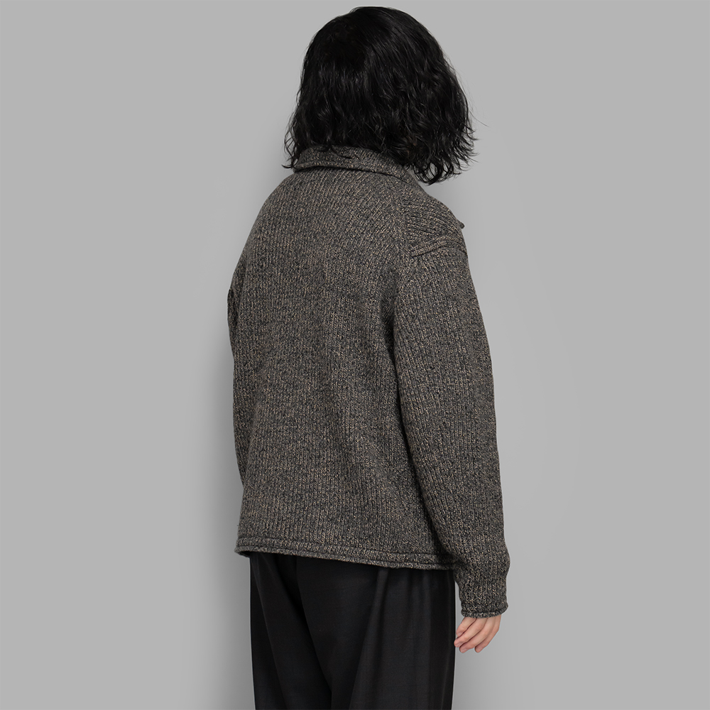 素材は、英国羊毛と南米ウールをブレンドしたシャンブレー調のウール素材を使用しています。ふんわりとした弾力とハリ感のある糸をベースに、甘撚りの糸を加えてアクセントとすることで、一般的なニットよりもしっかりとしつつも、柔らかみのある質感の生地に仕上げています。また、細かな杢のような表情を表現しているのもポイントの一つです。
