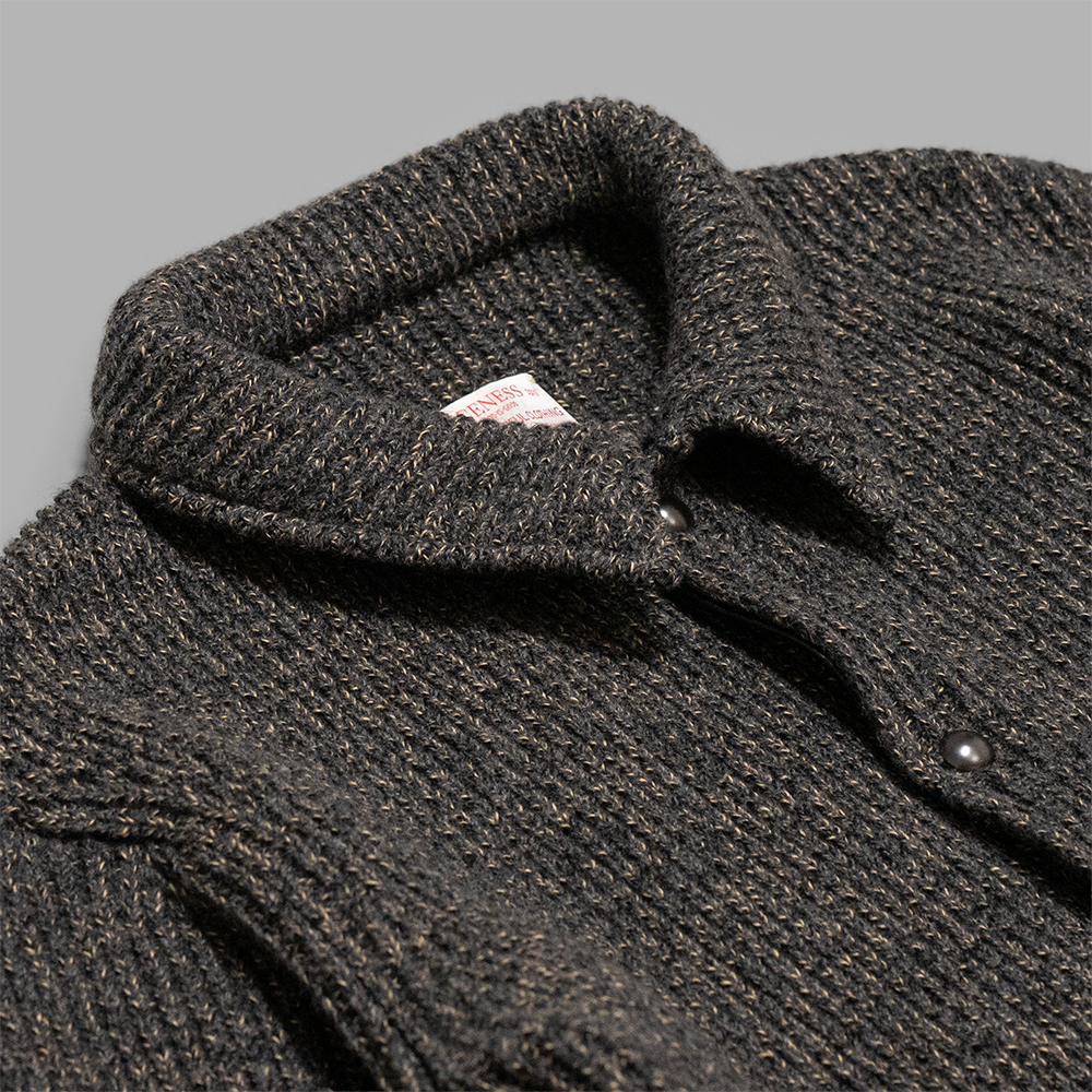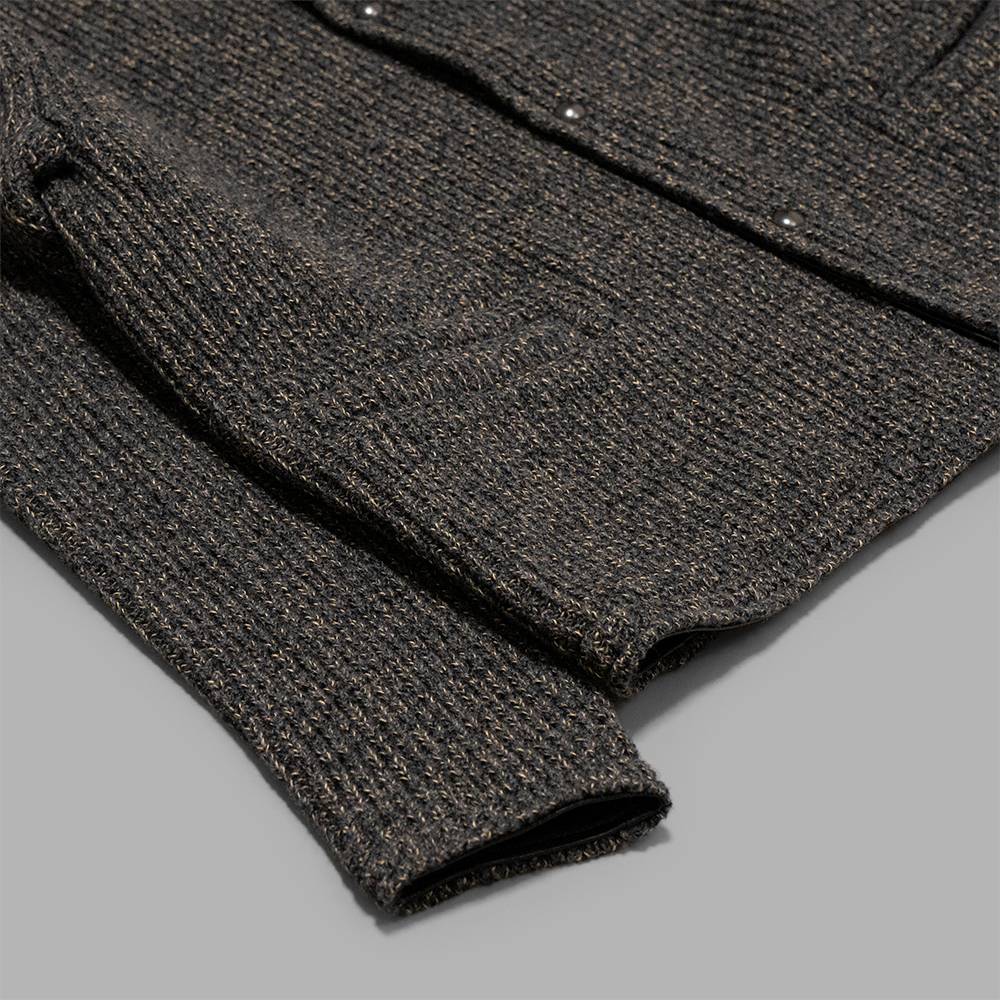 型は、1930~1960年代のUSビーチジャケットにインスピレーションを受け製作されており、現代でも着用しやすいよう、肩を少し落とし、身幅を広めに取るなどしデザインし直されています。ニット成型後には、レザー工場の職人に依頼をし、負荷のかかる箇所には全て牛革で縫製を加えることで、耐久性の向上だけでなく、ニットに見えない上質なビーチジャケットに仕上げています。