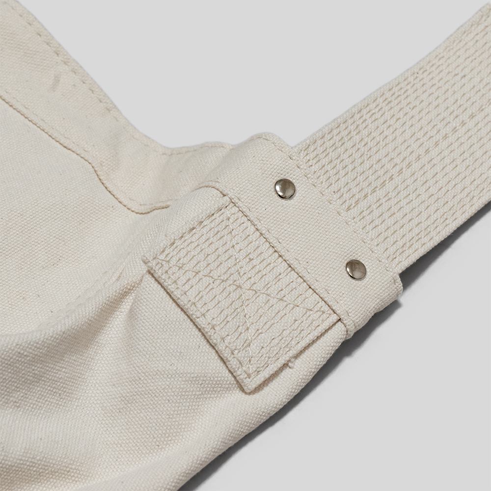 ウォッシュ加工を施したヴィンテージ調のキャンバス地と鉄製のパーツを使用。古いタイプのニュースボーイバッグに見られる、リベット留めによるディティールや、縫製などの仕様も忠実に再現しています。