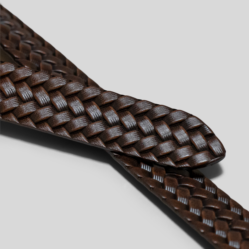 凹凸が美しい籠目のような編み模様を施したレザーを使用しています。ユニフォーム、ウエスタン、バイカーなど、多くのシーンで、スタイル問わず支持された革のデザインであり、特徴の編み模様の型を綺麗にのせるため、適度な厚みや硬さに細心の注意を払い仕上げています。また、ブラウンは奄美大島で一枚一枚泥染めして作製しています。
