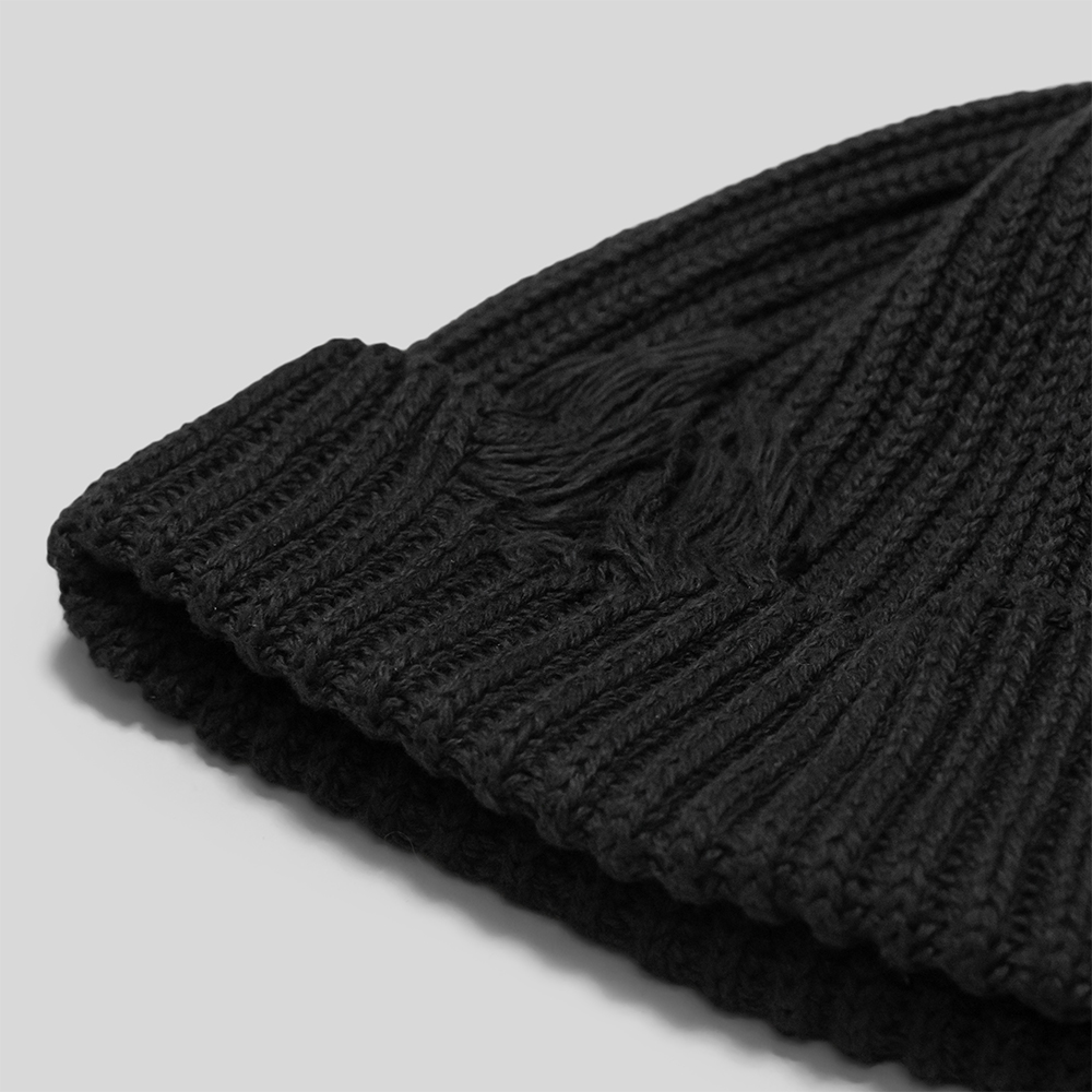 素材は、ヴァージンコットンの落ち綿を100%リサイクルし製作された、ワッチキャップになります。太番手の糸を使用しているので、程よく厚みがあり、しっかりとした生地感となっています。最終工程に、硫化染めや編み地がほつれたかのような製品加工を施すことで、ヴィンテージアイテムのようなデザインに仕上げています。