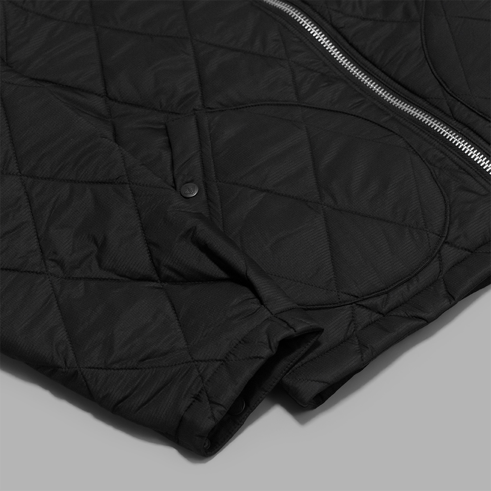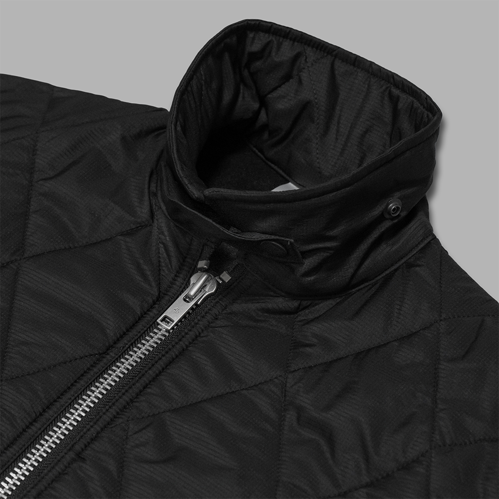 表地のキルティングは、撥水性の高いナイロンリップストップで、中綿は蓄熱機能のある国産の機能綿を使用しています。更に、ライニングにも蓄熱機能のあるトリコット裏地を組み合わせ、保温性を高めています。キルトのパターンは、クラシックなダイヤ柄を採用しています。