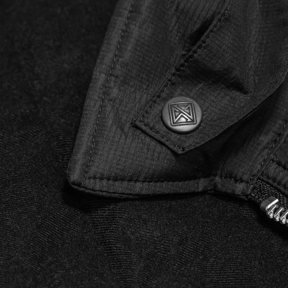 フロントは通気性や使い勝手を考慮したダブルジップ仕様で、衿裏には着脱可能なチンフラップがあります。裾や袖口はスナップボタンで調整することも可能です。身頃脇に大きめのハンドウォーマーポケットを配し、後身頃衿下には、本シリーズ専用のネームタグが付けられています。
