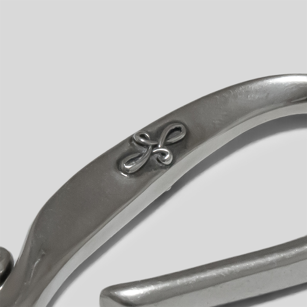 極めてシンプルなデザインですが、クラフト感のとても強く出たアイテムです。また、日々使いながら生まれる経年変化がより一層引き立つことも特徴です。フックの部分には簡略化された花のレリーフがさりげなく入ります。