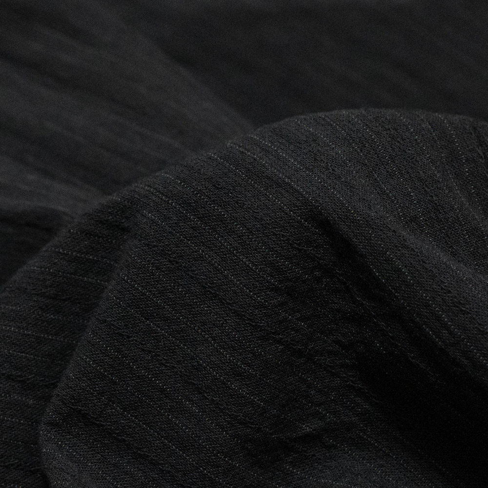 ベースにZ撚りのコットン強撚⽷を使⽤し、ストライプ部分にはポリエステルシックレンを組み合わせた、ドビーストライプ素材を使用しています。⽣成りの綿⽷をガス焼きすることで⾃然な⾊味を引き出した生地を、ブラックの染料を用いてオーバーダイをすることによって、奥行きのある色味を表現しています。