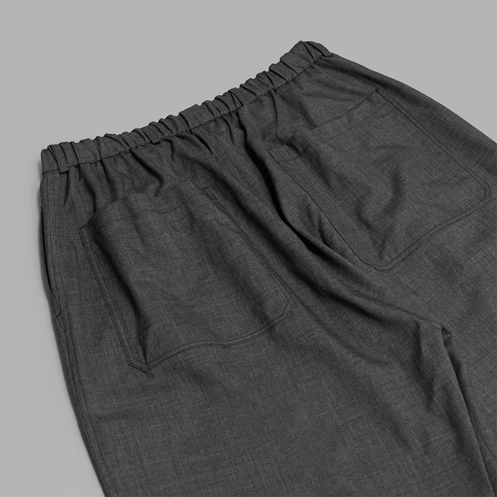 型はMITTANの定番であるストレートシルエットのパンツで、程よいゆとり感と適度な丈感が特徴です。ウエストはゴム仕様になっており、内側の紐でベルトなしでも快適に着用できますが、ベルトループも配しているため、ポケットをしっかり活用する際などにベルトを使用することも可能です。