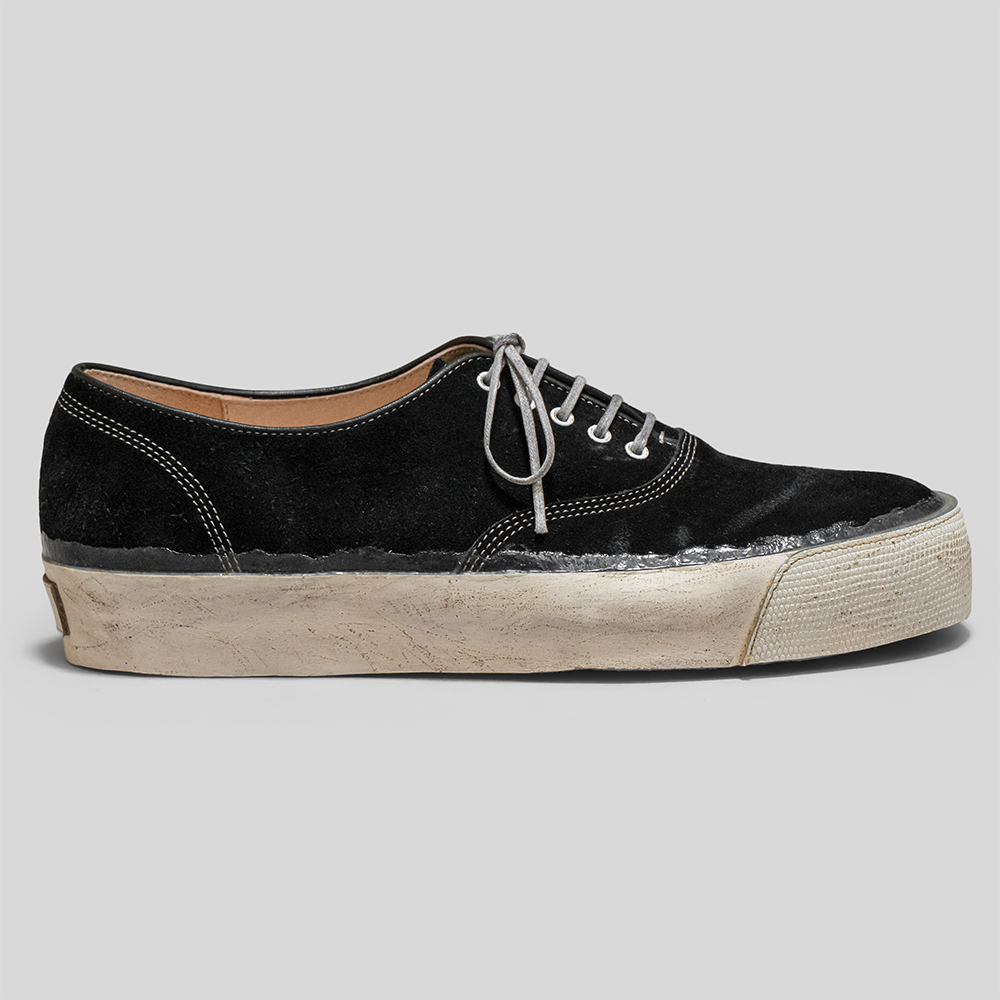 USミリタリーのボートシューズとジョージア・オキーフの汚れたコモドールから着想を得て、ベロア、ピッグヌメ、ステアなど多様な革素材を用いてデザインされたレザーヨットシューズです。