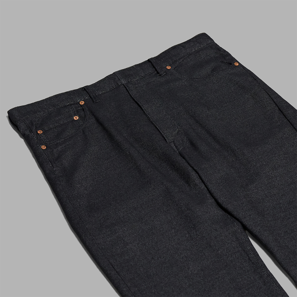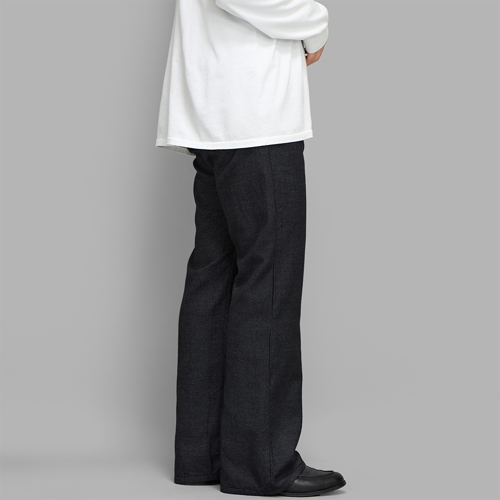型は、NICENESS初期を想起させる1970年代のセミフレアデニムをリファレンスとし、現代的に修正・調整されたイージーパンツです。構築的でありながらリラックス感があり、シルエットは緩やかなフレアを描きながら上品な落ち感を感じられ、懐かしさと新しさが静かに共存する、時代を超えて育てる一本です。前立てはトップボタンの無いジップのみの仕様です。