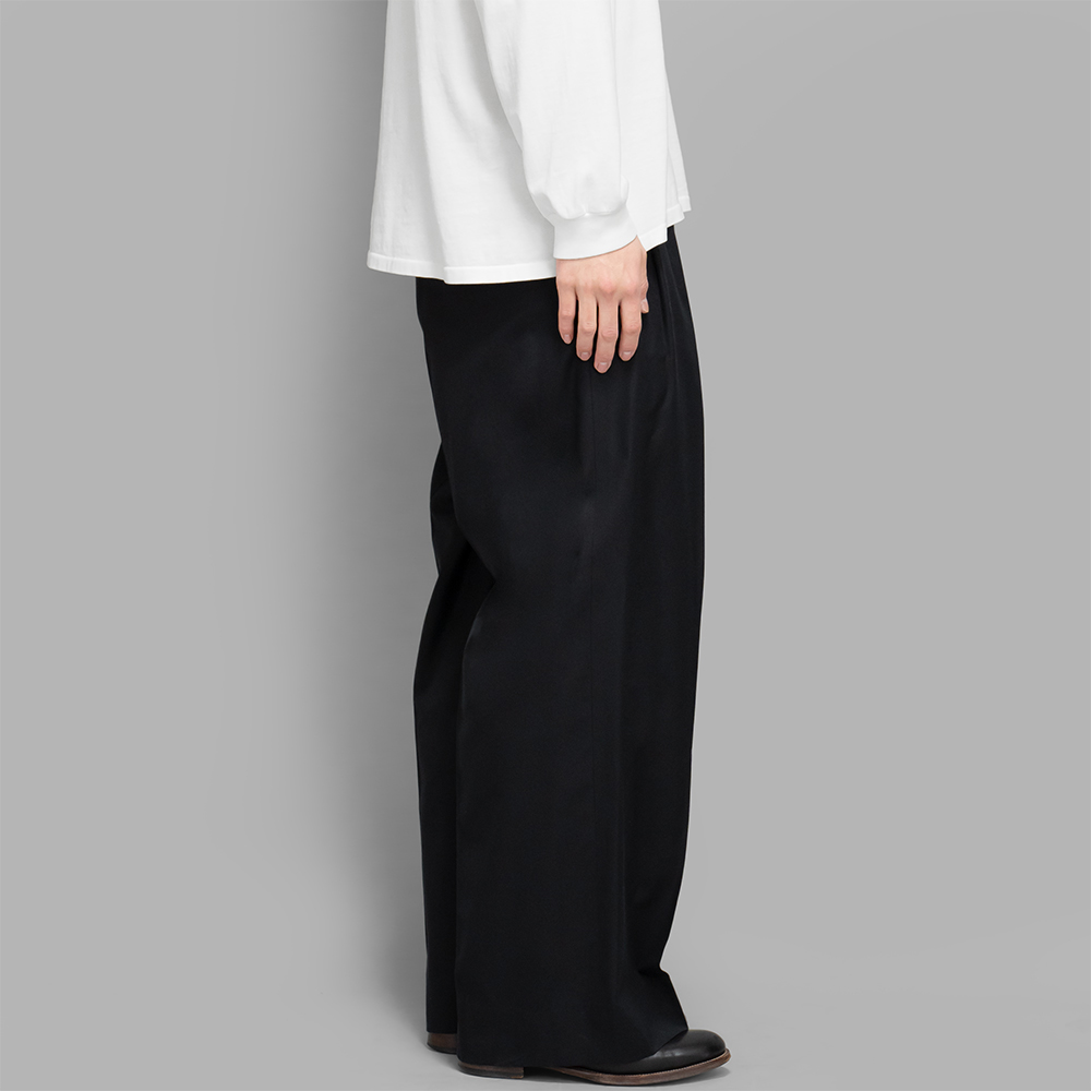 型はわたり幅から裾幅までワイドに設定し、バック部分のみイージー仕様で製作されたツータックトラウザーズです。丈はEXTRA WIDE TROUSERSとほぼ同じで、同ブランドが展開される他のトラウザーに比べると若干長めに設定され、縦方向への落ち感の印象を強くしています。前立てはジップ開き、裏地はありません。