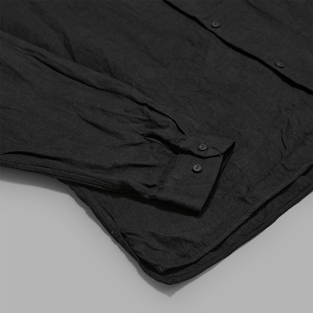 程よくゆとりを持たせたオーバーサイズのシルエットで、やや短めの着丈に設定したシャツです。生地の持つ自然なシワ感や表情を活かすため、強度が求められる箇所以外では表に出るステッチを最小限に抑えています。