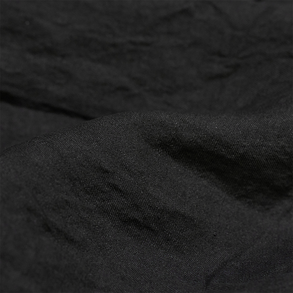 経糸に和紙糸、緯糸に大麻糸を用いたオリジナルの生地です。エクアドル産のマニラ麻を原料とした和紙を1mm以下にスリットし、撚りをかけたフィラメント糸を使用しています。軽量で毛羽立ちが少なく、速乾性と強度に優れ、和紙の持つハリと大麻の柔軟さを組み合わせることで、独特のシワ感としなやかさを併せ持つ風合いに仕上げています。カラーは天然の草木を染料として染色しており、柿渋と墨の染めを掛け合わせることで、単色の染めでは出せない深く独特な発色を表現しています。