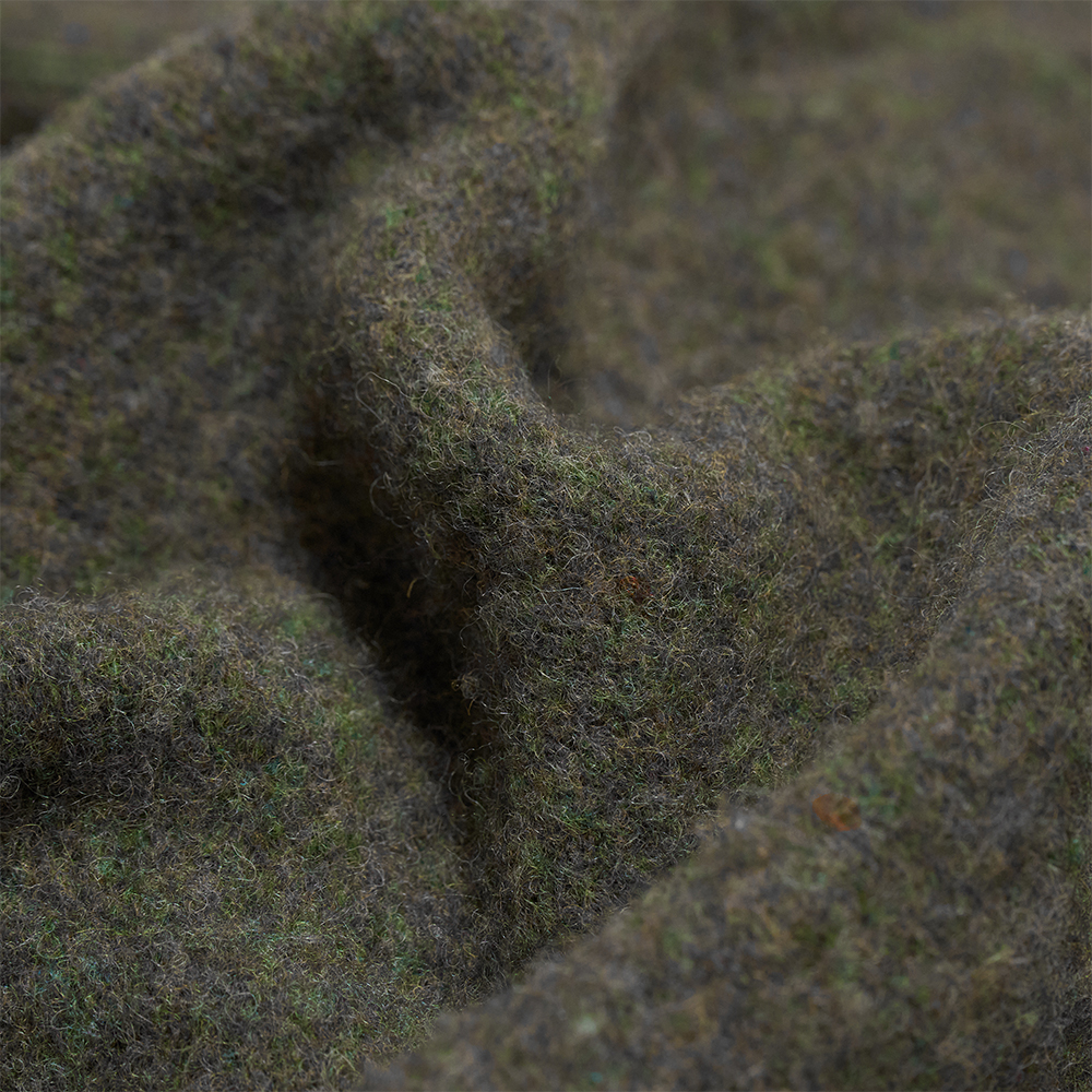 多色の糸で編み込まれたミックスニット素材を使用しています。随所に見られるネップや温かみを感じさせる表情が特徴です。襟はボディーの素材と好相性なヌバックレザーが採用されています。