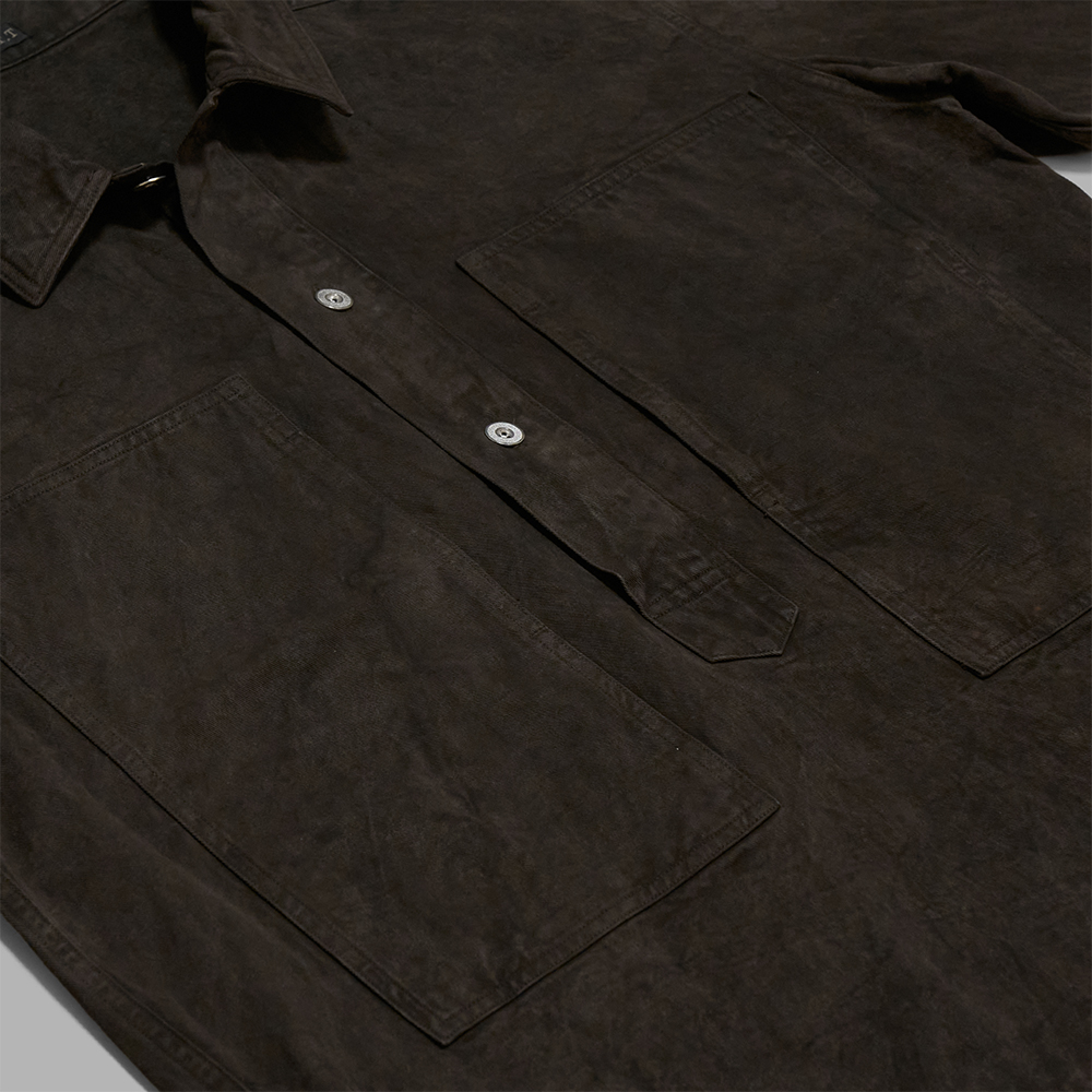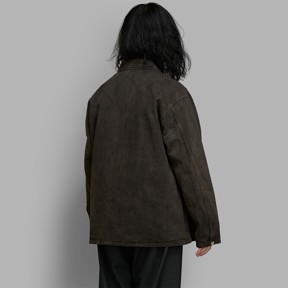 素材には綾目の綺麗なコットンツイル素材を使用しており、厚すぎない生地でありながらもハリコシのあるタフな生地感が特徴的です。また、天然染料を用いた泥染によるムラ感やステッチのアタリなど、とても雰囲気のある生地に仕上がっています。ボタンには、US ARMYの文字を削ぎ落として製作した、ミニマルなオリジナルボタンを採用しています。