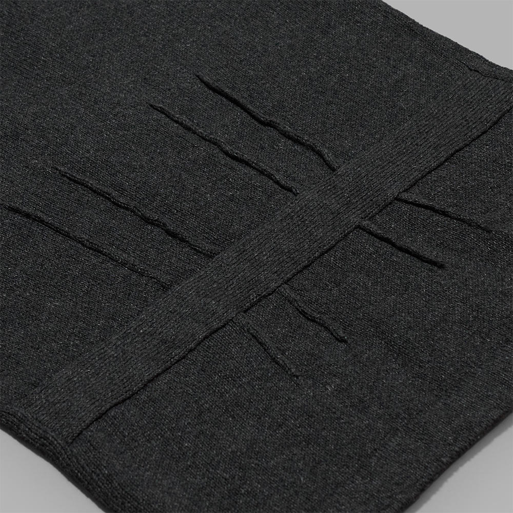メランジの綿2本と麻1本を組み合わせ、3本撚りにした糸を用いて編み立てたニット素材を使用しています。奥行きのある深い陰影としっとりとした質感が特徴的な素材です。
