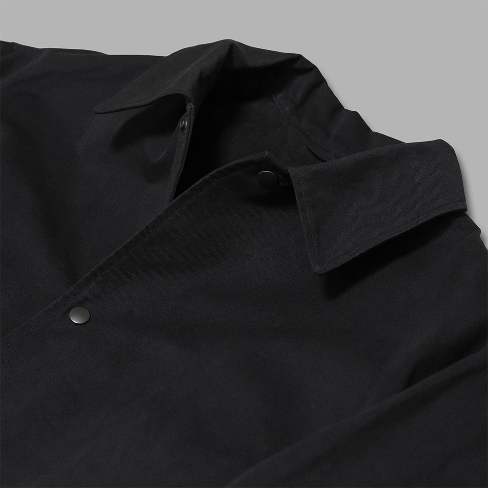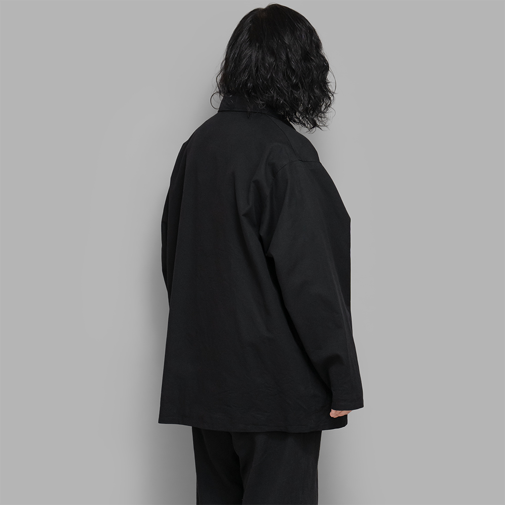 型は、ゆったりしたサイズ感で作られたカバーオール型のジャケットです。腰ポケットにドット釦のみのディティールで、匿名性の高いユニフォームのような雰囲気にしています。中はフラットなコットンネルの総裏で、内ポケットを2つ付けています。袖口にスナップが付きます。