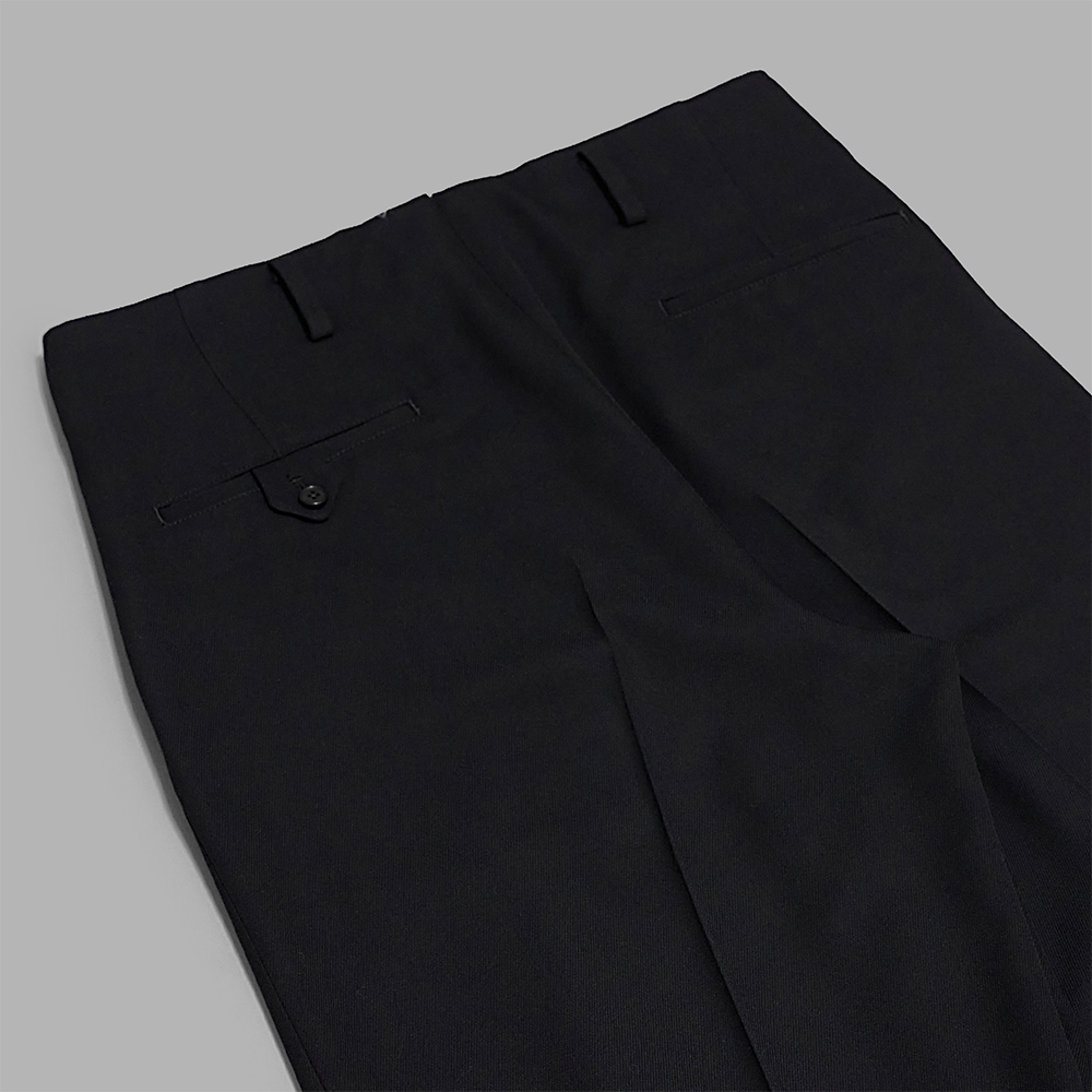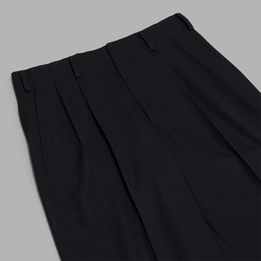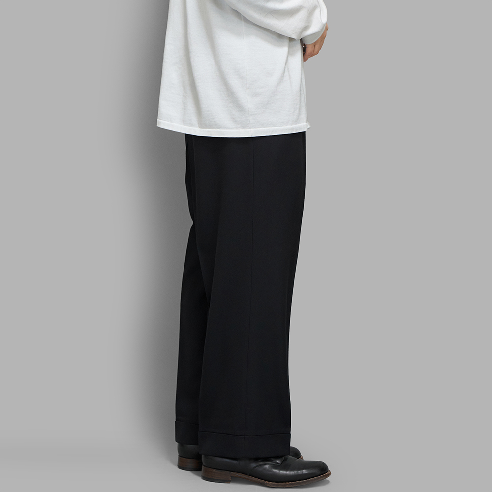 デザインは、ウエストのベルトレスデザインが特徴的な2プリーツワイドパンツで、裾はダブルの仕上げです。型は、腰回りに程よくゆとりをもたせ、膝下から緩やかにテーパードをかけています。ピスポケットの細玉縁、腰裏のマーベルト仕様、棒シック仕様など、細部まで丁寧に仕立てられていることも特徴の1つです。前立ては、ririファスナーとオリジナルのホーン釦を採用しています。