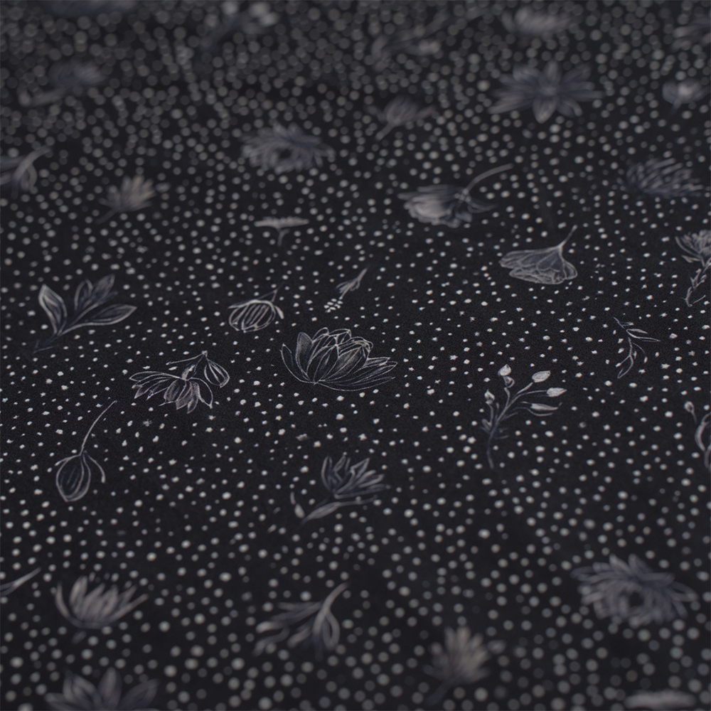 素材は、経⽷にシルクの⽣⽷、緯⽷には長い繊維をあえてカットし、撚り合わせて製作したスパンキュプラ⽷を打ち込んだ、平織組織のオリジナル⽣地を使用しています。全体にシルクならではの上質な雰囲気を感じさせつつ、緯⽷のスパンキュプラがほどよいハリ感を加えています。オリジナルのフラワー柄をインクジェットプリントで表現し、プリント後にワッシャー加⼯と天⽇乾燥を施すことで、ナチュラルな表情に仕上げました。