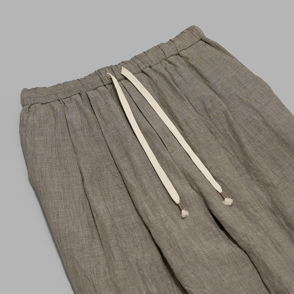 素材は、80番⼿の超極細リネンの⽣成り⽷と、ダークカーキに染⾊した⽷を使⽤して織り上げた、先染めの千⿃格⼦組織の⽣地を使用しています。経⽷には、合成繊維の⽔溶性ビニロンを巻き付けて織り上げ、ワッシャー加⼯の際にそのビニロンを溶解させ、”千⿃格⼦の繊細な組織と、ビニロンを溶かすことで⽣まれる微細な隙間と、ワッシャー仕上げによる柔らかな質感が⾒事に調和し、美しく奥⾏きのある⾵合いに仕上がっています。