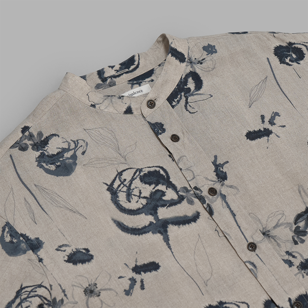 型は、水墨画のような⼤胆なフラワー柄を引き⽴てるため、前⽴てを裾まで開けないプルオーバータイプのバンドカラーシャツです。ヨークにギャザーを施し、ヴィンテージ感のある雰囲気に仕上げています。また、着丈の前後さや身幅にゆとりを持たせることで、動きに合わせてなびいた際や、光が当たり具合により、生地や柄に陰影や奥行きが生まれ、生地の風合いと豊かな表情をより一層感じられます。ボタンには、水牛釦の表面に焼き加工を施した、陶器のような質感の釦を採用し、クラシックな印象を加えています。