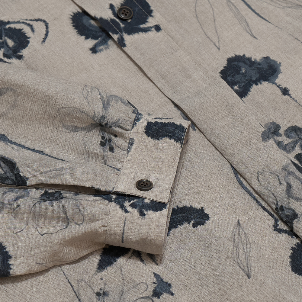 素材は、経緯⽷ともに極細リネンを使⽤した平織りの⽣地を使用しています。織布の際に経⽷が切れないよう、合成繊維の⽔溶性ビニロンを巻きつけてから織り上げ、その後ワッシャー加⼯を施してビニロンを溶かし、独特の⾵合いに仕上げています。さらに、尾州の加⼯場にて⽣成⾊のまま晒さず、プリントの下地加⼯を施した後、京都の染⼯場にてインクジェットプリントを施すことで、⿇特有のムラ感が残り、ナチュラルで味わいのあるプリント地に仕上がっています。
