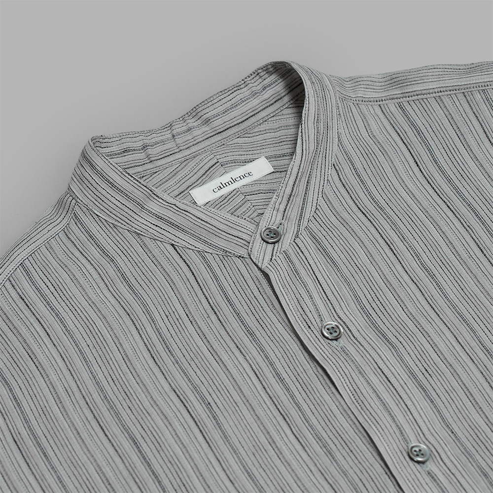 製品完成後には、丁寧な手洗いと天⽇乾燥を施すことで、味わい深いヴィンテージ感を表現しています。手作業による工程も多く含まれた、唯一無二の存在感のある1着は、シャツ1枚のスタイルでも、雰囲気のある着こなしを楽しめます。また、首元に綺麗にそうバンドカラーは、インナーにあわせた際の収まりがよく、ジャケット類のインナーにもおすすめです。
