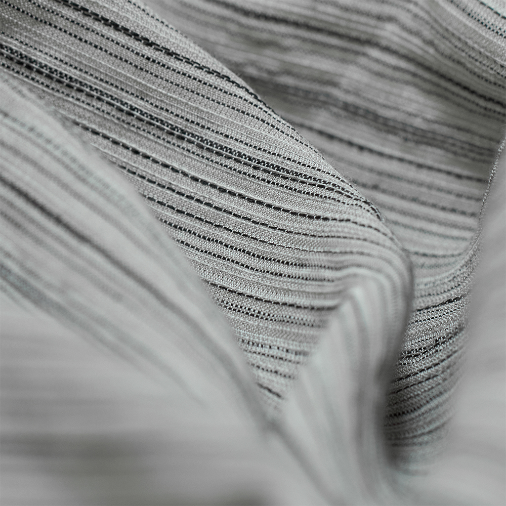 素材は、極薄のシャツ地に仕上げるため、経⽷に細番手のレーヨン⽷を採用し、緯⽷には一般的に薄手のシャツ等に使用される太さのコットン⽷、リネン⽷と、太めのコットン⽷をランダムに配置し、ジャカード織機にてボーダー柄に織り上げた生地を使用しています。ボーダー⽣地を横使いすることで、あえて縦ストライプのシャツ地として使⽤しています。清涼感あふれる⾵合いは、まるでインドの⼿織り布を思わせるような味わいを持ち、ナチュラルな表情に仕上がっています。