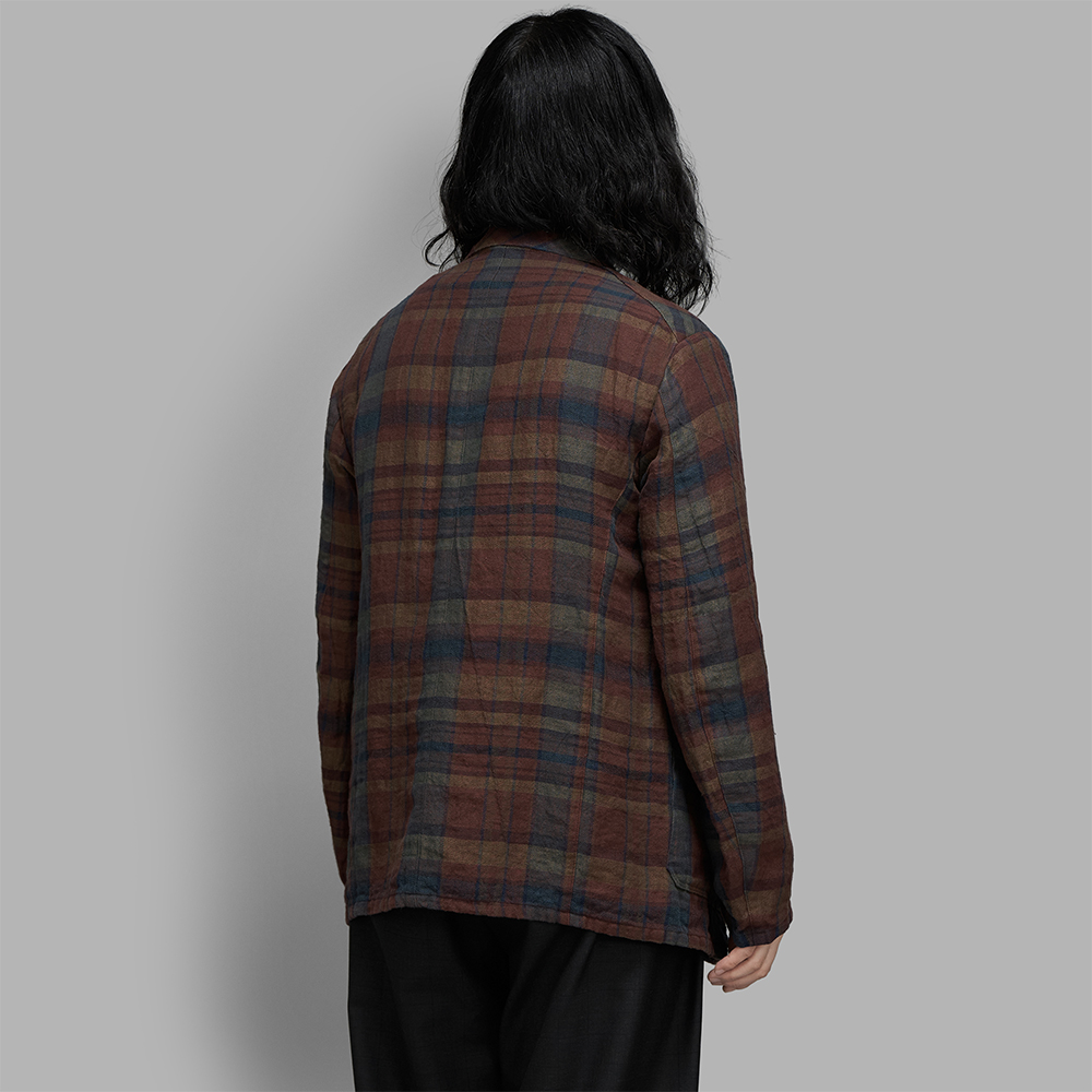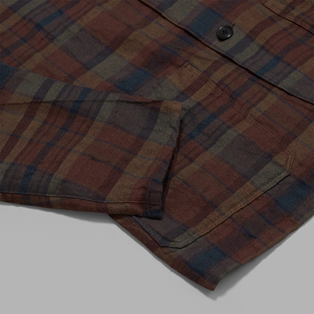 発色が良く鮮やかなものが多いマドラスチェックですが、こちらは製品染めによってダークトーンを重ね、深みのある色合いに仕上げています。スタイリングにも自然と馴染む、落ち着いた印象のマドラスチェックです。