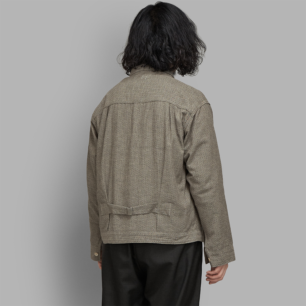 型はLot.703(※) がベースのジャケットで、片方のみにパッチポケットが付いており、前見頃にあるプリーツを止めるステッチの一本ずつのみという簡素な作りになります。シルエットは真っ直ぐに付いた袖と肩傾斜がない肩線によって、平面的な作りに仕上げています。特注の刻印入りボタンとバックは全て鉄製で表面にメッキ加工を施していません。そのため、時間が経てば錆びてきて、経年変化を楽しむことができます。