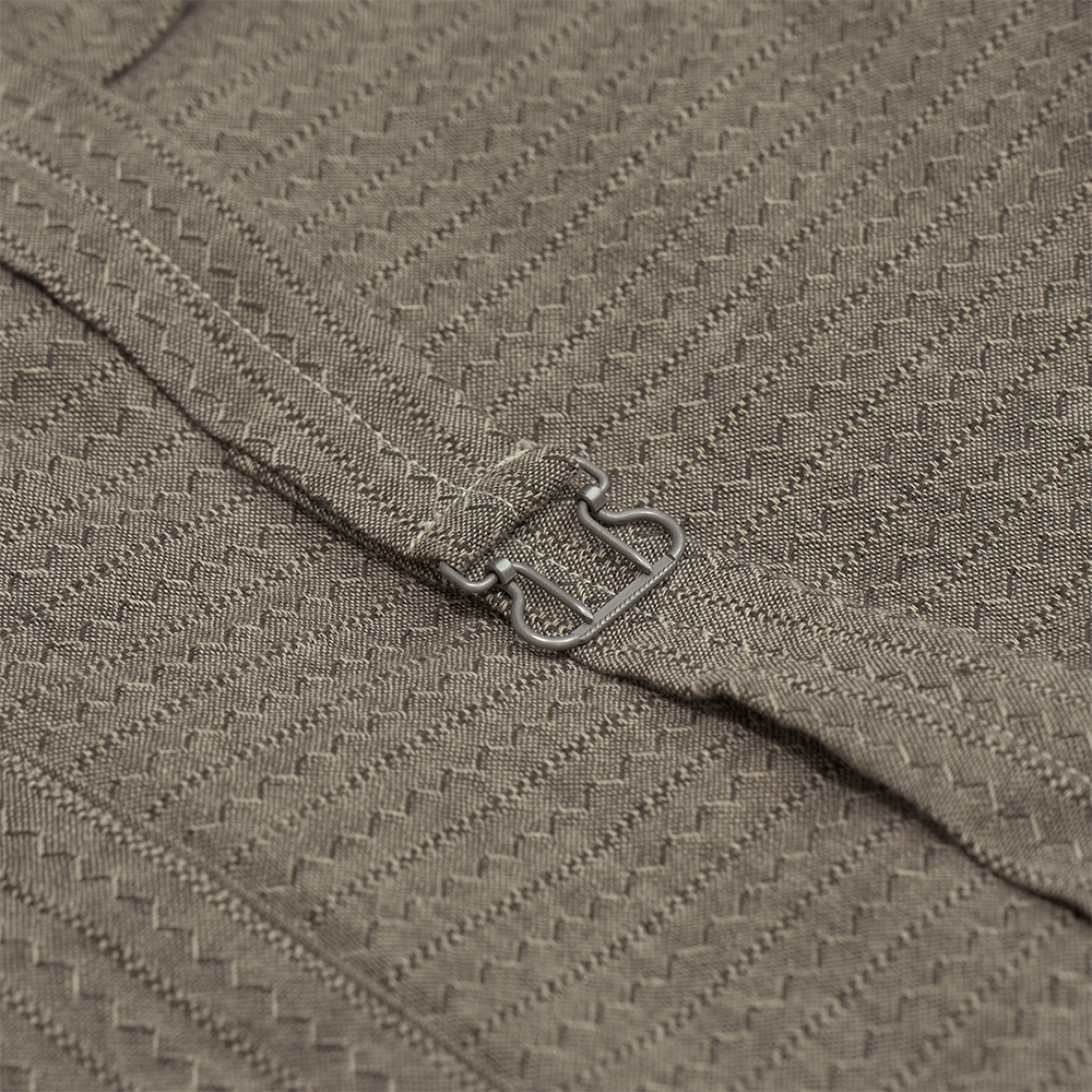 生地には、1930年代のワークシャツ用として流行した“Tupelo Madras Chambray”と呼ばれるジャカード生地を再現した素材を使用しています。生地には脱脂ワッシャー加工を施し、ドライタッチに仕上げています。また、経糸には硫化染めのグレーの糸を用いることで、着用するごとに程よく色が抜け、独特な味わいが増します。