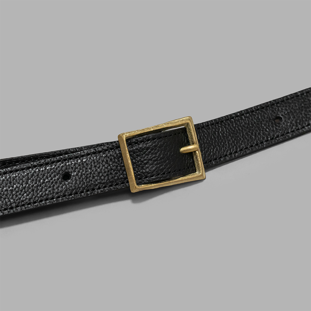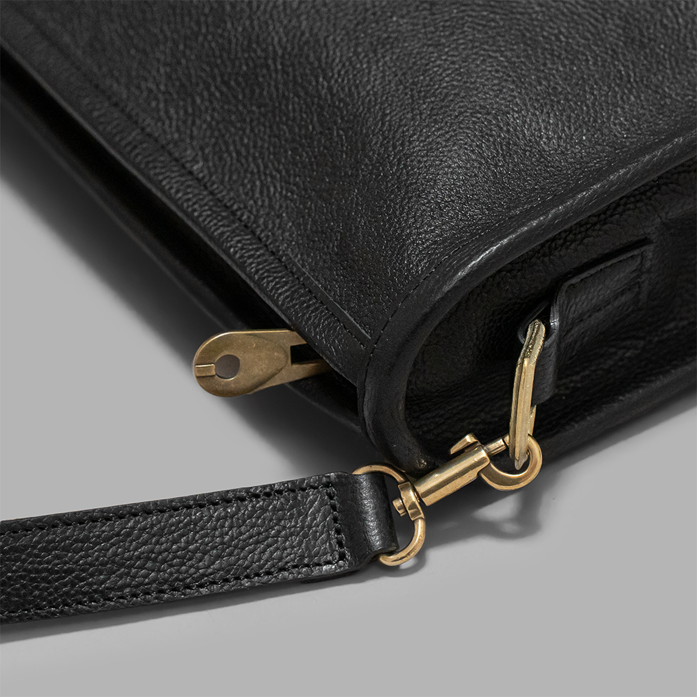 ショルダーストラップは、長さ調整が可能で、ライニングに別素材のスムースレザーを使用しています。彫刻のように繊細で美しいカッティングが施されたオリジナルの真鍮金具のバックル、存在感のあるWALDES社のファスナーなど、細部のパーツ使いにも拘りと感覚の良さを感じます。