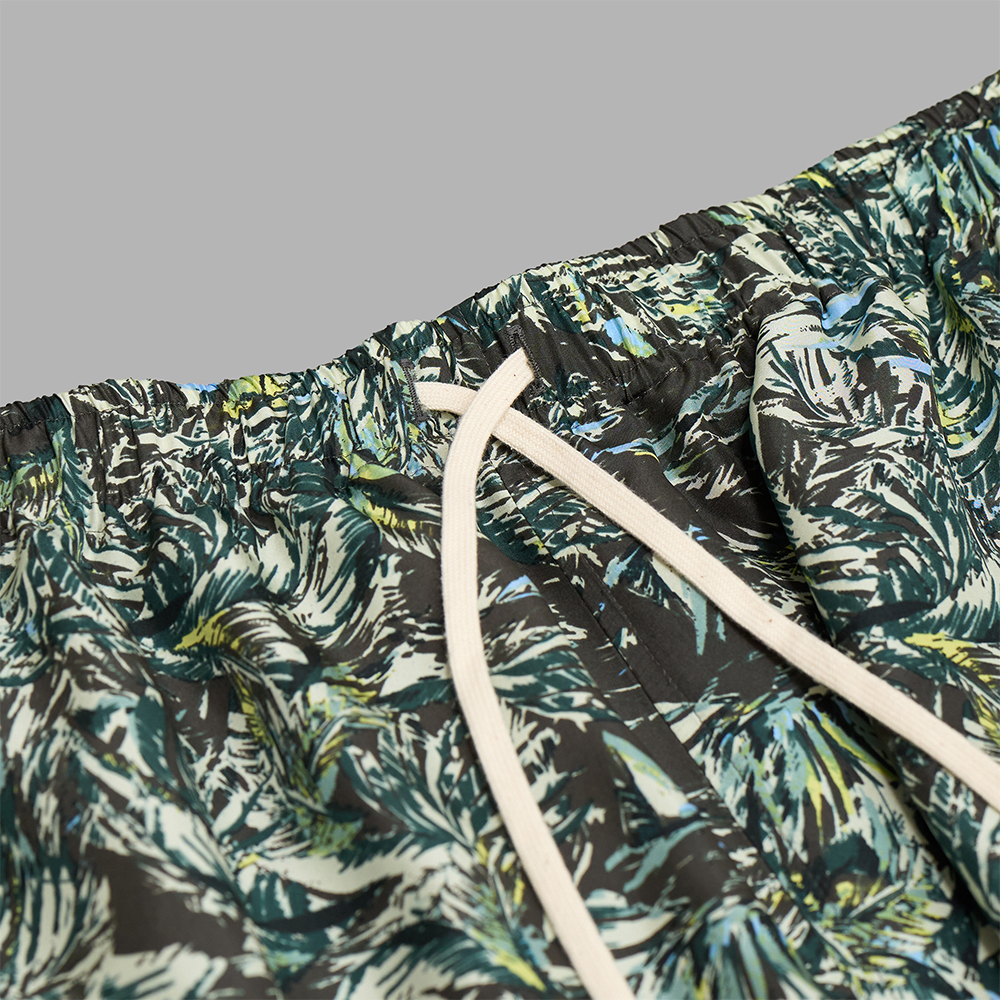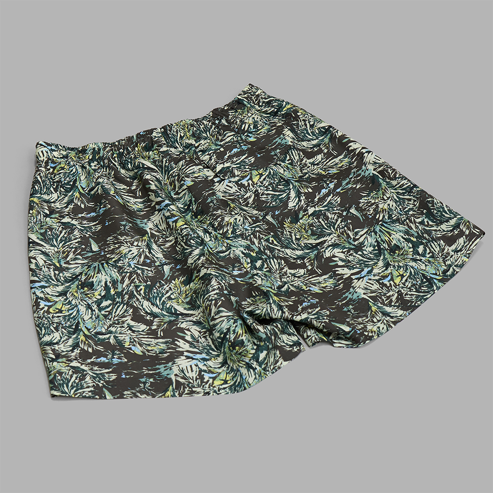 型は腰回りはゴム・紐を通したイージーパンツの仕様で製作されたショートパンツとしてデザインしています。膝丈ほどのスッキリしたバランスで、内側は透けが気にならないように薄手のキュプラ素材をライニングに採用しています。