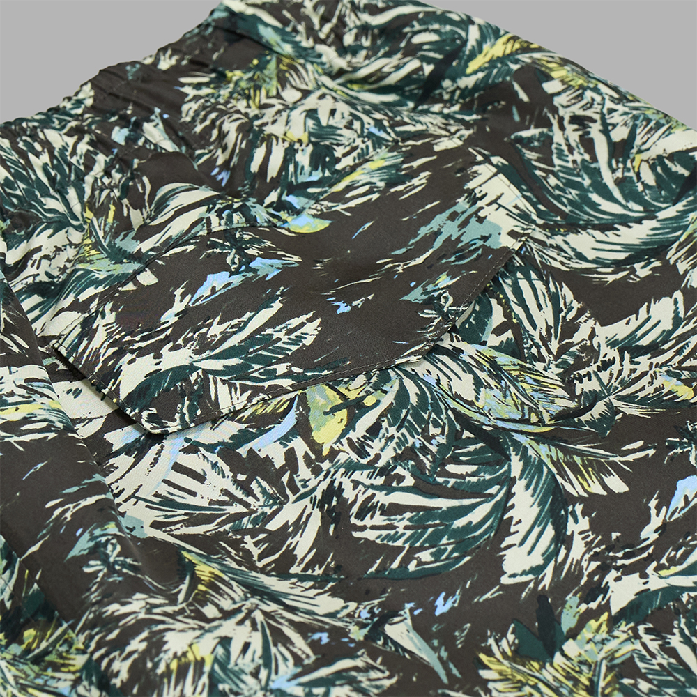 シルクの生糸を高密度に織り上げた、絹羽二重素材を使用しています。日本の代表的な絹織物でもあり、シルクならではのきめ細やかな極上の肌触りと、上品な光沢感が特徴の素材です。総柄のリーフプリントは、ハンドプリントから蒸し、水洗、整理仕上げまで、すべて国内の一貫工場で丁寧に行われています。全7色を重ねてゆく手捺染によって、色の奥行きも加わり、7色以上に見える豊かな表情が生まれています。