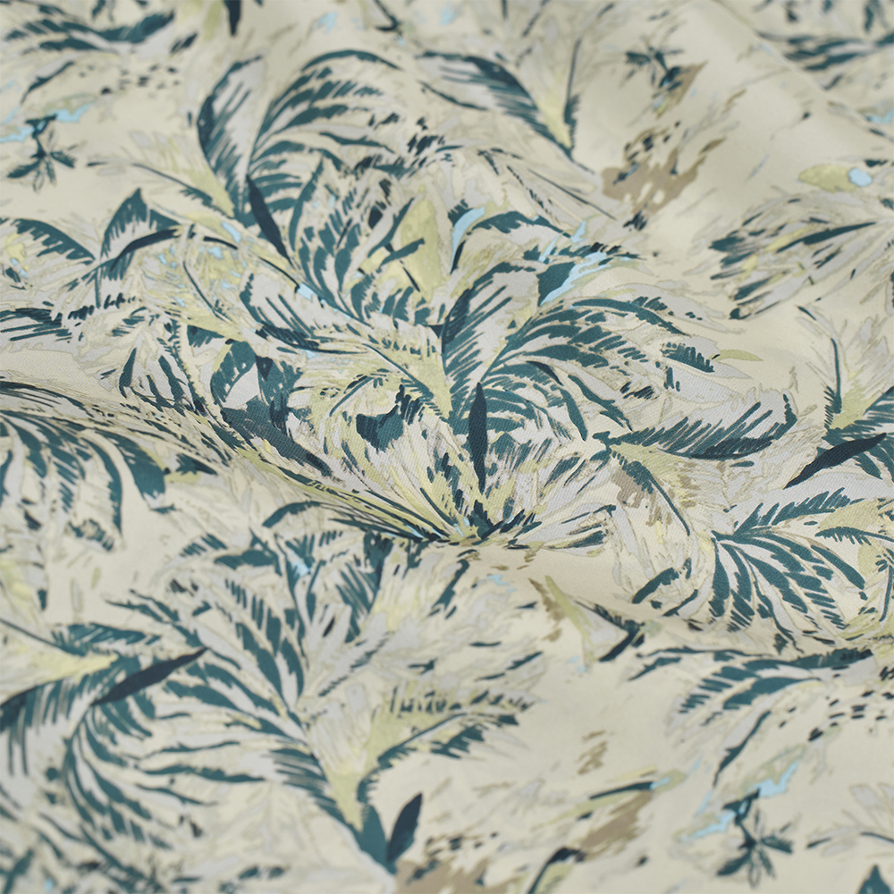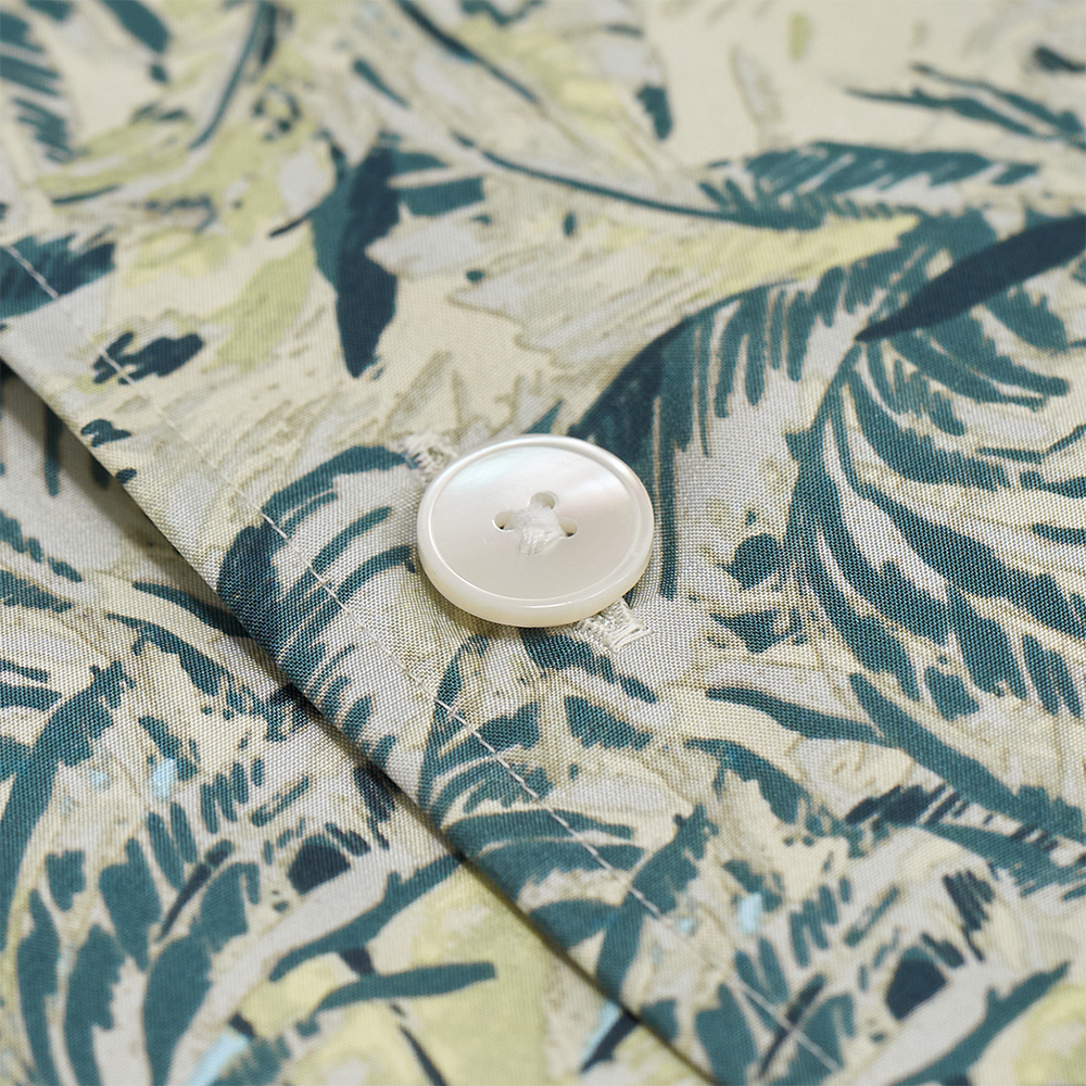 シルクの生糸を高密度に織り上げた、絹羽二重素材を使用しています。日本の代表的な絹織物でもあり、シルクならではのきめ細やかな極上の肌触りと、上品な光沢感が特徴の素材です。総柄のリーフプリントは、ハンドプリントから蒸し、水洗、整理仕上げまで、すべて国内の一貫工場で丁寧に行われています。全7色を重ねてゆく手捺染によって、色の奥行きも加わり、7色以上に見える豊かな表情が生まれています。