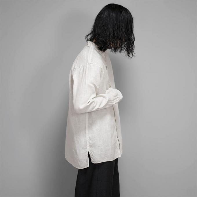 デザインは大麻の素材感との相性が良く、仕立て映えのするスタンドカラーを採用しています。スリットの入るフラットな裾のデザインも相まって、シャツジャケットのような雰囲気も感じます。