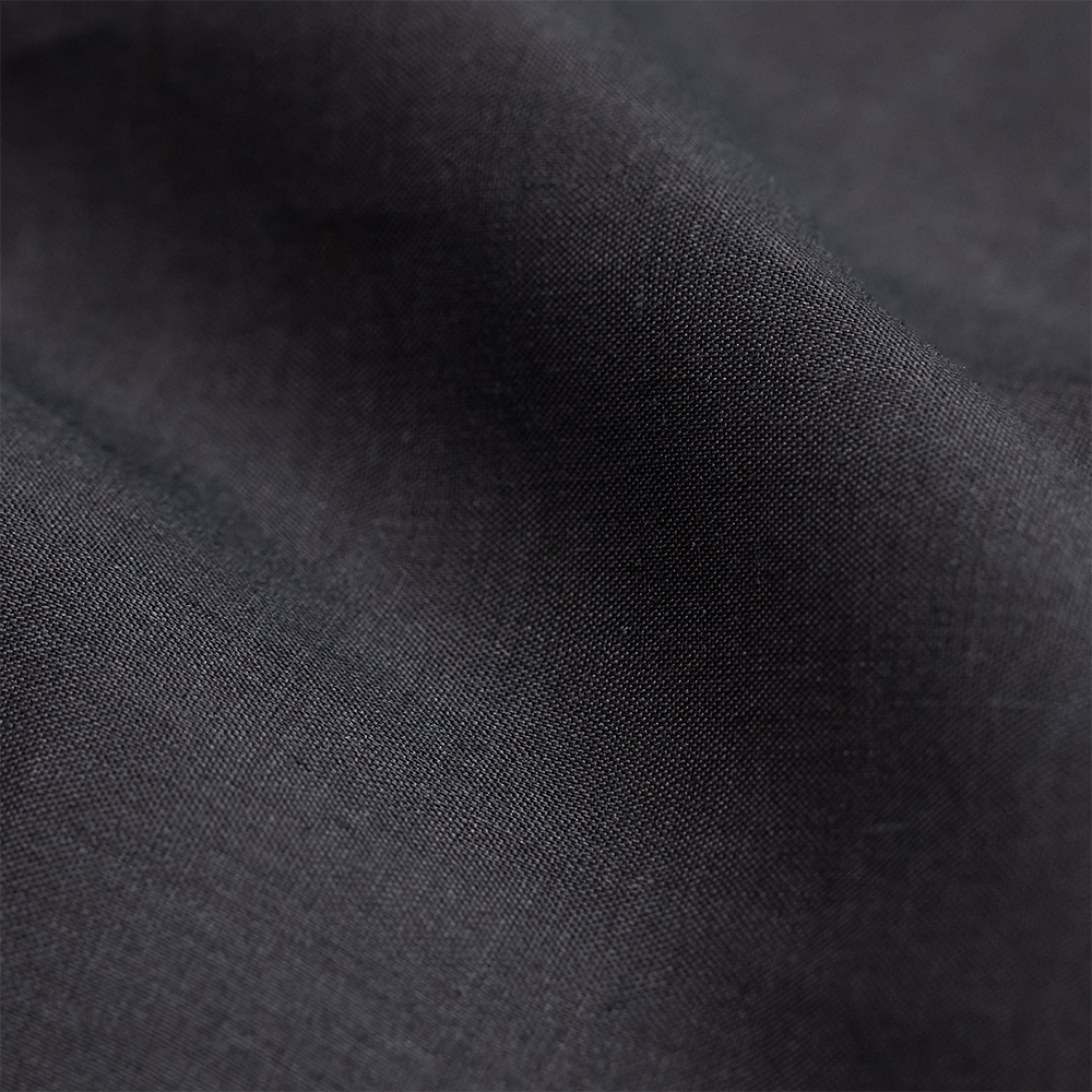 ラミーのさらりとした素材感と、シルクの品のある柔らかな光沢が組み合わさることで、シンプルながらも目を惹くアイテムに仕上がっています。また、墨黒は無彩色でありながらも、わずかに赤みや青みを含んだ、深みのある色合いとなっており、合わせる色を問わず、様々なスタイリングに取り入れやすいのも魅力の一つです。