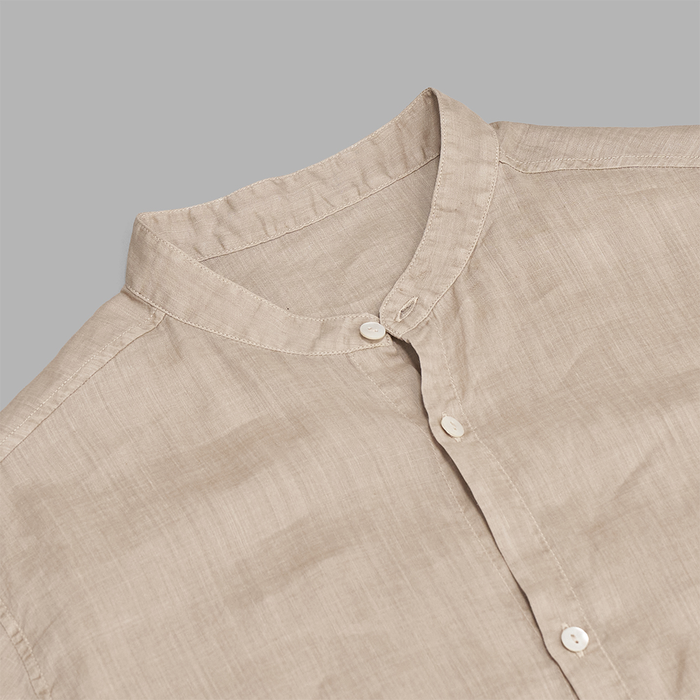 型は、生地の透け感を活かしつつ、日常使いを意識した程よくゆとりのあるシルエットのスタンドカラーシャツです。袖山にはいせ込みを入れて運動量を確保し、脇にはスリットを設けるなど、機能性を備えながらもシンプルなデザインに仕上げています。切り込みを入れないカフスや、ヨークを設けずに折り伏せ縫いで肩を縫い合わせることで、繊細な生地への負担を抑えています。ボタンには貝ボタンを使用しています。