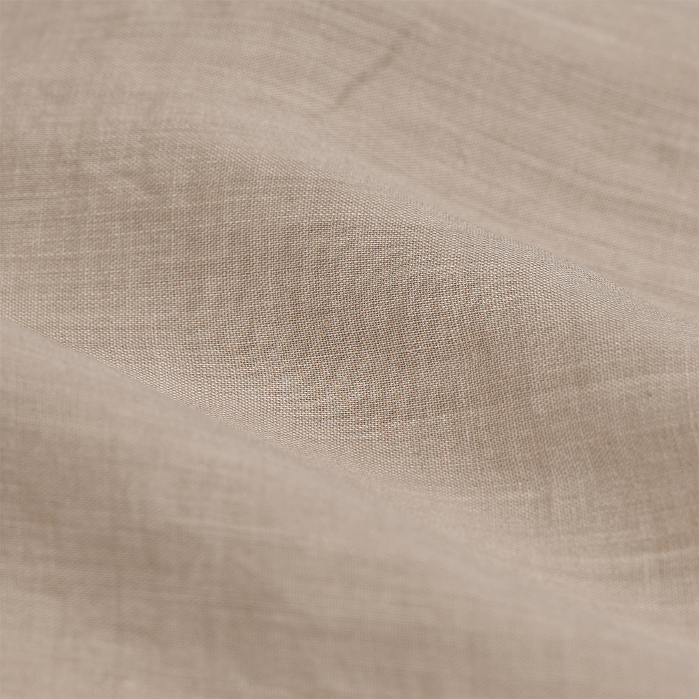 素材は、経糸にラミー100%の糸、緯糸にはラミーとシルクを混紡した糸を使用し、非常に軽量で薄手の生地に仕上げています。通常、160番手という極細糸は紡績が難しいため、水溶性の糸で補強を加えながら丁寧に織り上げています。仕上げに湯洗いすることで補強部分を取り除き、夏時期にも着用できる、軽さと薄さを両立した生地に仕上げています。