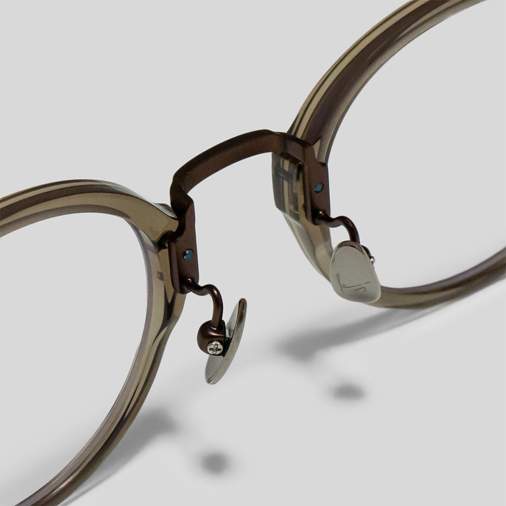 ノーズパッドは薄型の軽量チタンを使用しています。テンプルの形状にも工夫を凝らし、軽いかけ心地に仕上げていることも特徴です。