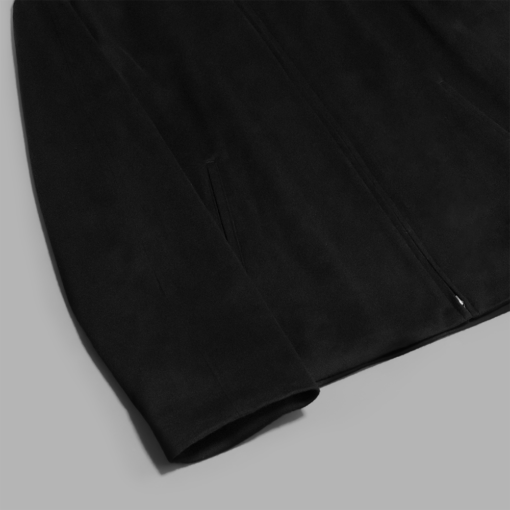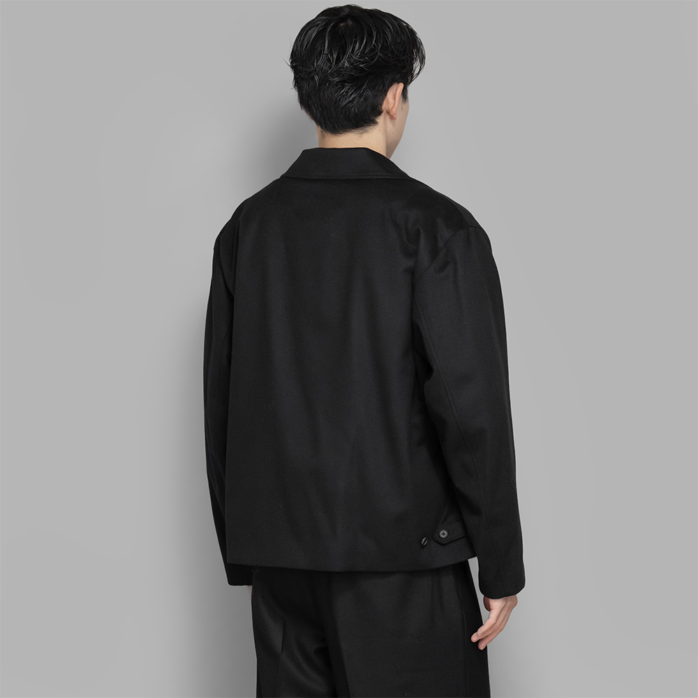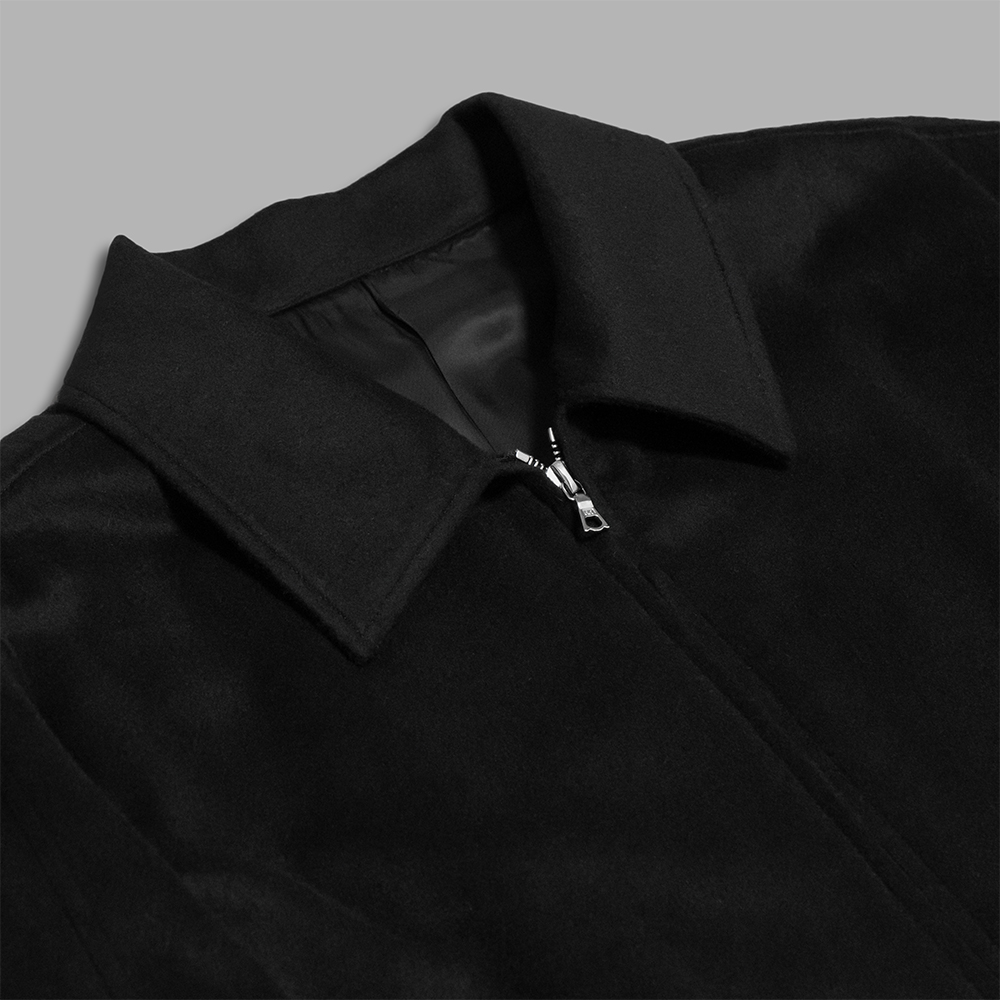 型は、上質な生地の表情を活かすように極力ミニマルな印象になるよう各ディテールを設定したショートジャケットのデザインです。中はキュプラの総裏で、内ポケットが2つあります。前立てはririのダブルジップを使用しています。