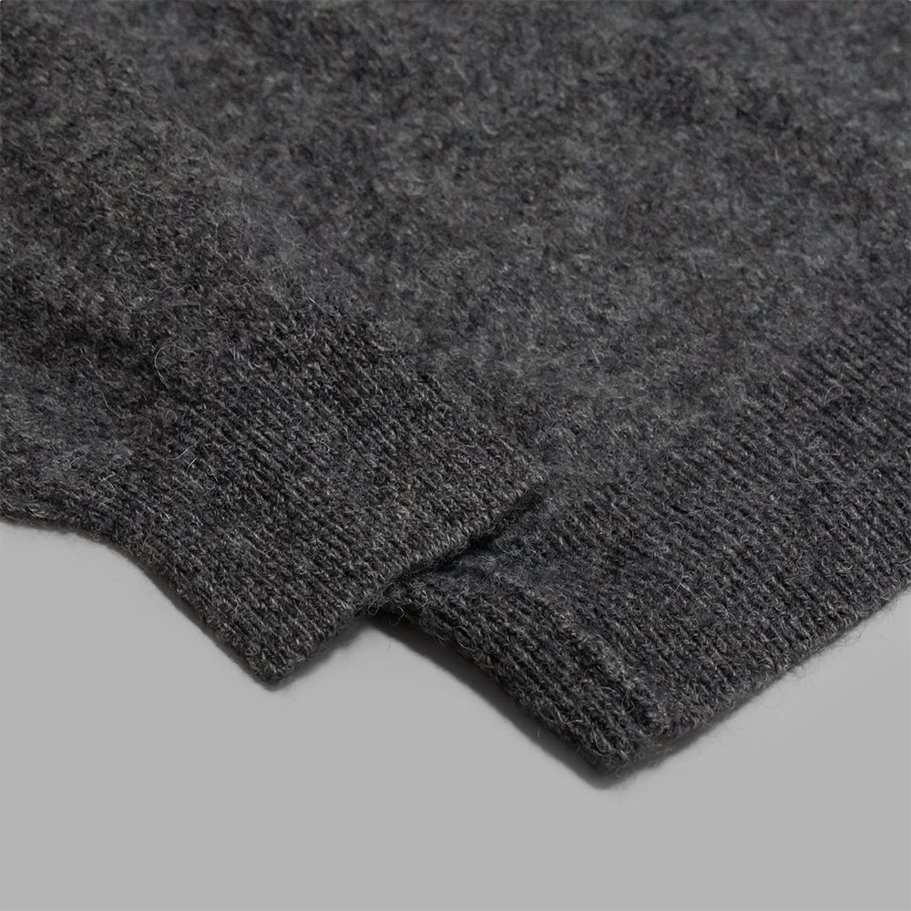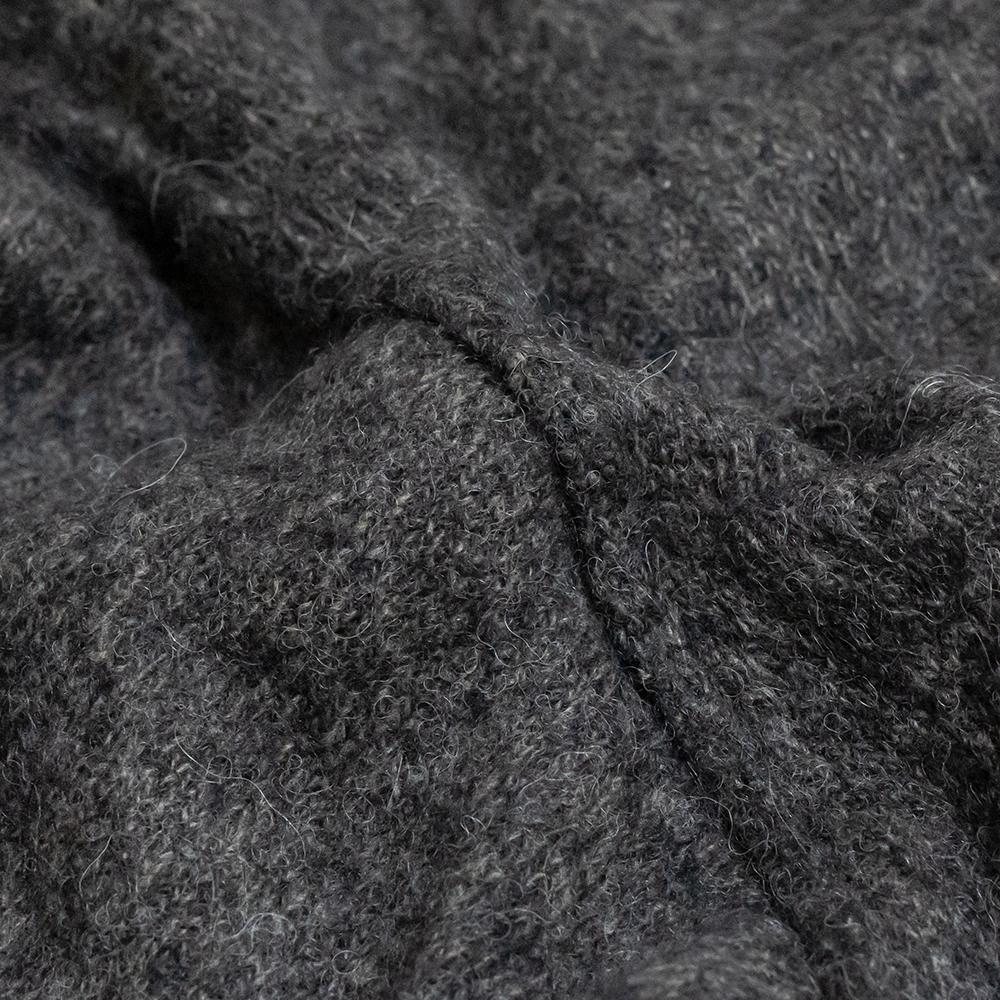 繊細で滑らかさに非常に優れたベビーアルパカと、上質なジーロンラムをかけ合わせた糸を使用したニット素材を使用しています。ウールの膨らみと、ベビーアルパカの繊細で柔らかい毛足が合わさった美しく、ミックス調の色味もポイントです。