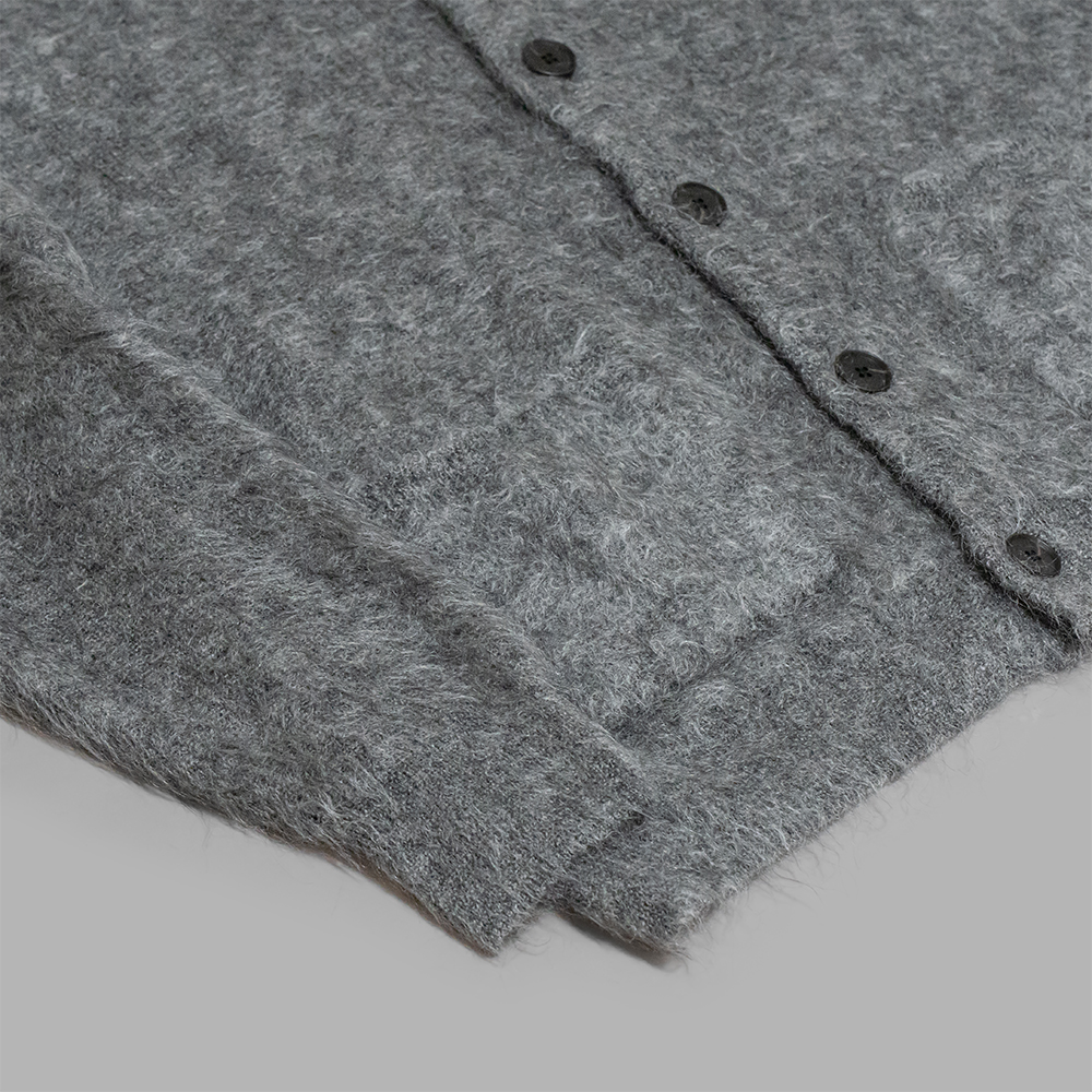 紡績ループ(ループ部分が甘撚り)を起毛している、南アフリカのキッドモヘアを使用した起毛素材から製作したニット素材を使用しています。芯糸、押糸のみナイロンで、糸の表面部分はモヘア100%の素材となり、自然な光沢感と毛足の長さを持つモヘアの特性を顕著に感じていただける、非常に柔らかく美しい光沢感が特徴的です。