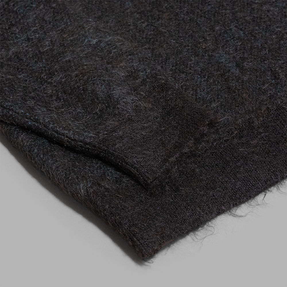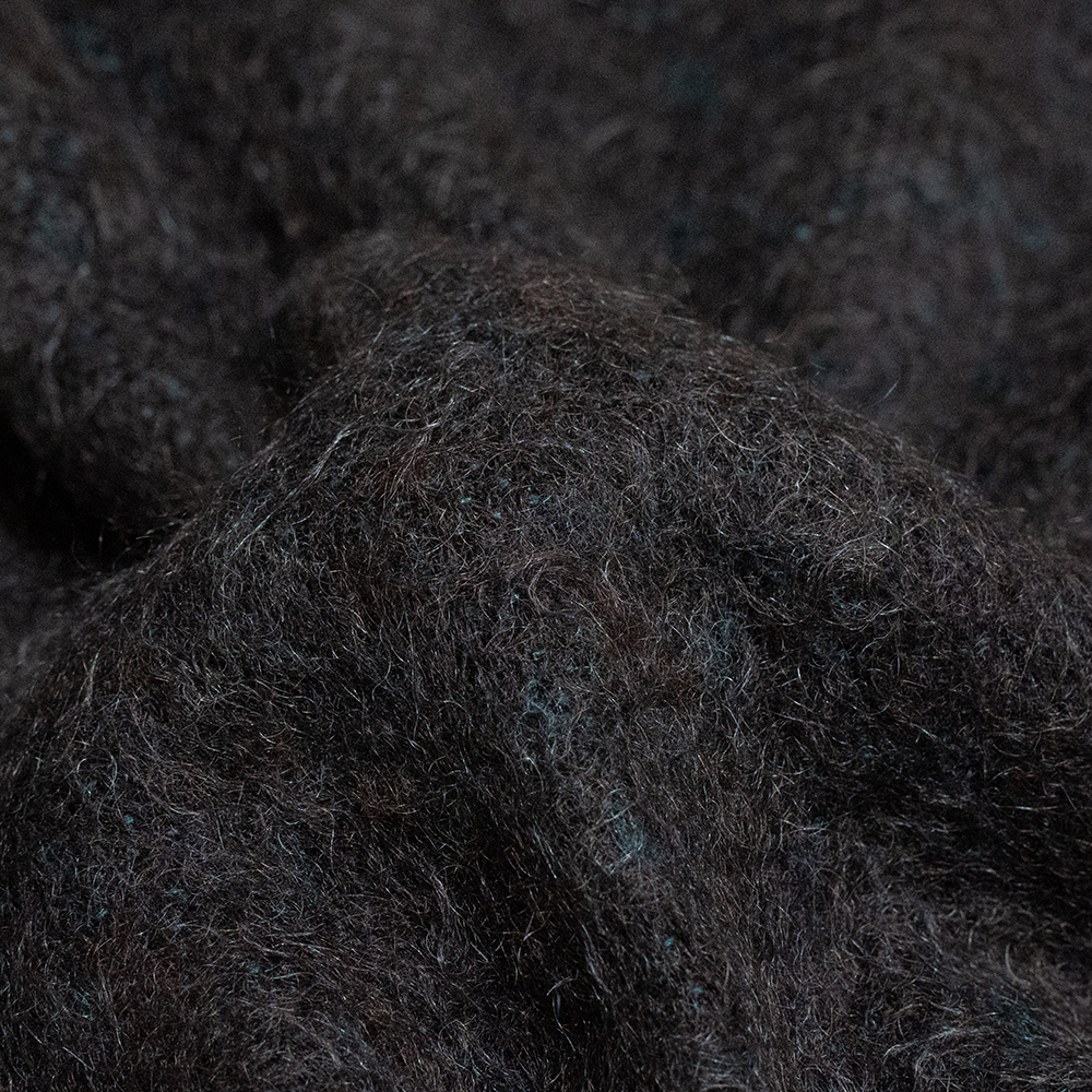 モヘアの中でも貴重な、滑らかで柔らかな着心地とふくらみのあるキッドモヘアを使用し、5色使用しながらあえて無地でジャカード編みし、一見単色ながら色味に奥行きを出したジャカードニット素材を使用しています。さらに、起毛加工を施すことで色が混ざり、独特な深い色に仕上げています。