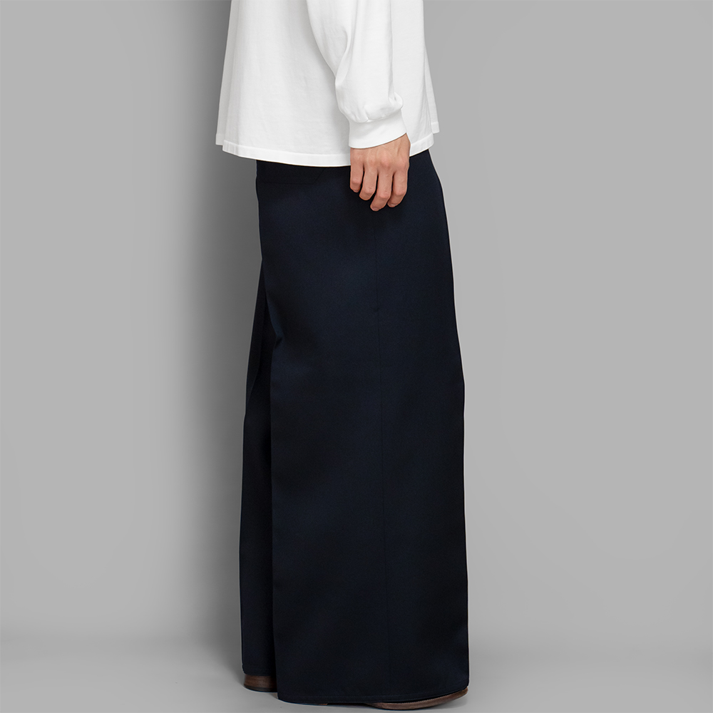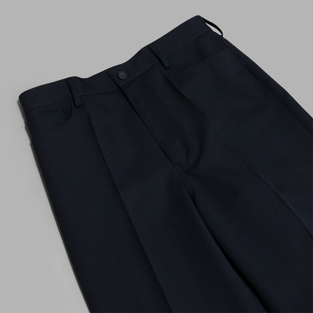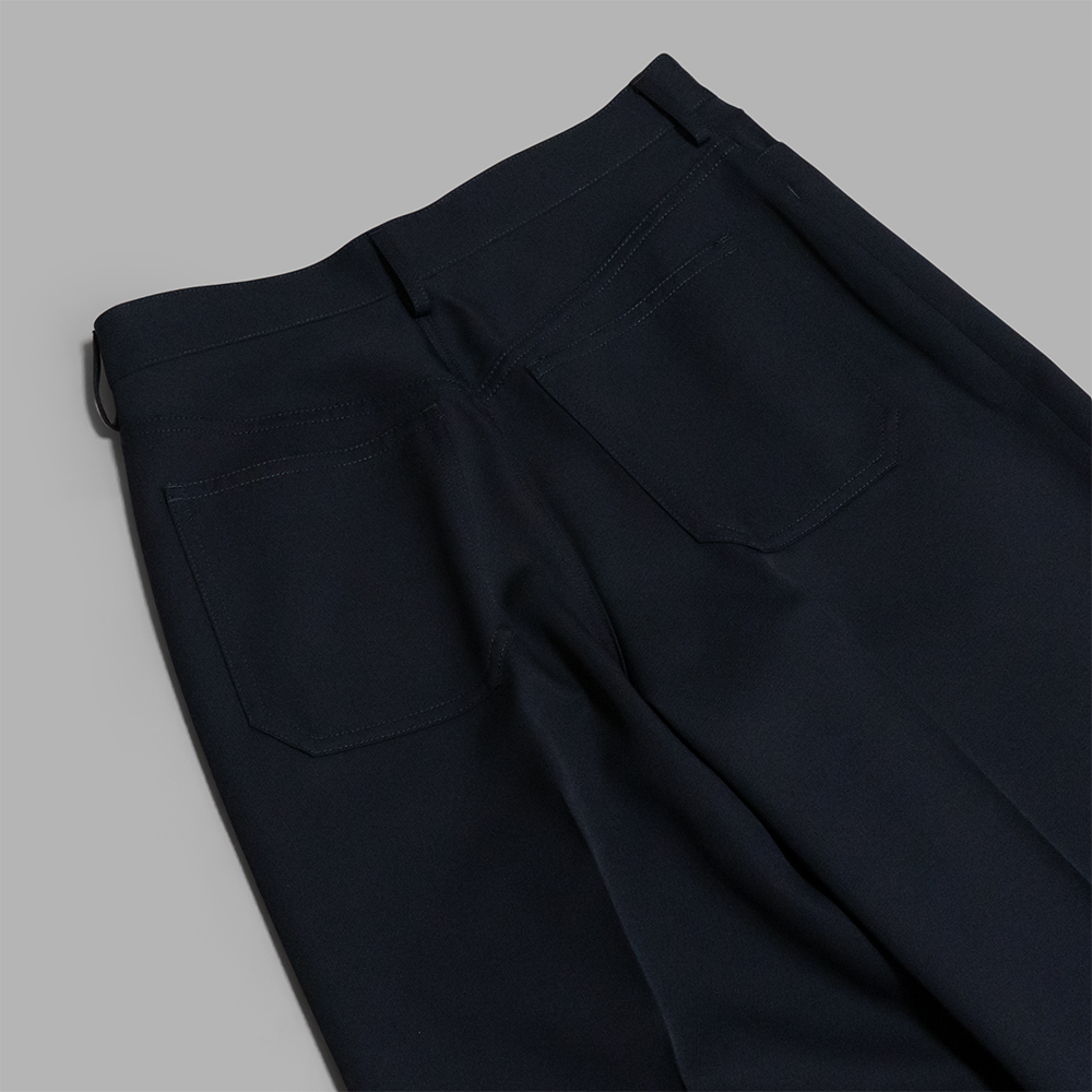 ワークパンツであるデニムのシルエットをパリッとしたウールで仕上げることで、モダンな印象のあるボトムスに昇華しています。裾幅まで太くボリュームのあるボトムスは、ニットやブルゾン、コートなど重量感のあるトップスともバランスよく合わせることが出来ます。