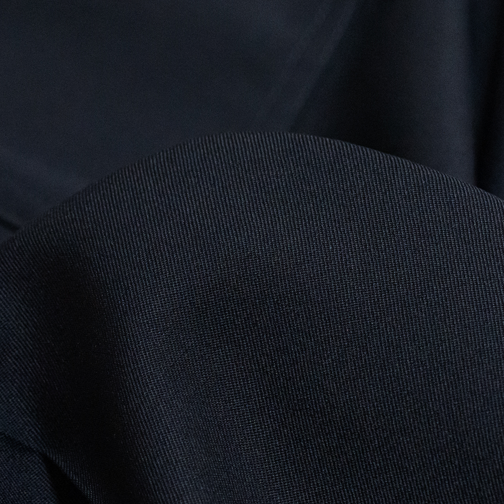 良質なウール原料を用いた3本撚りの糸を高密度に織り上げた、生地の膨らみと表面の艶感が特徴的なウールツイル素材を使用しています。仕上げにハリを出す加工を施し、シルエットが綺麗に整うような生地に仕立てています。