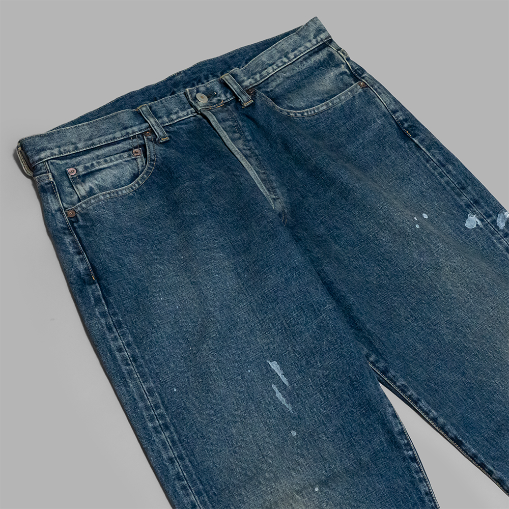 型はリーバイスの501XXのようなスッキリしたストレートです。リベットやステッチ、加工感に至るまでオリジナルにリスペクトを感じる仕上がりです。前立てはボタンフライ、サイドはセルビッチの仕様です。