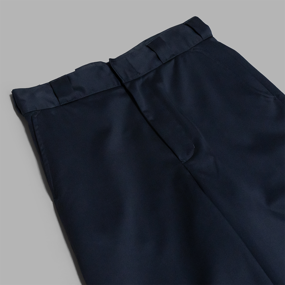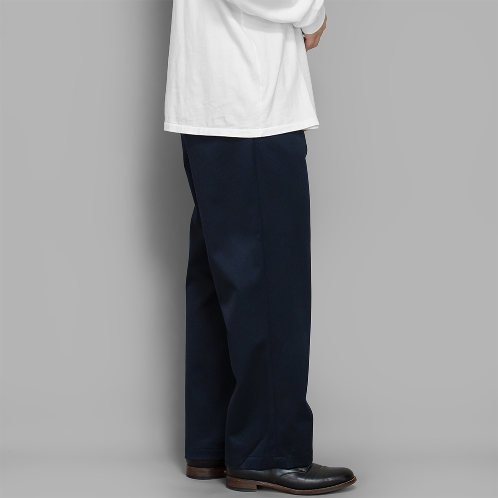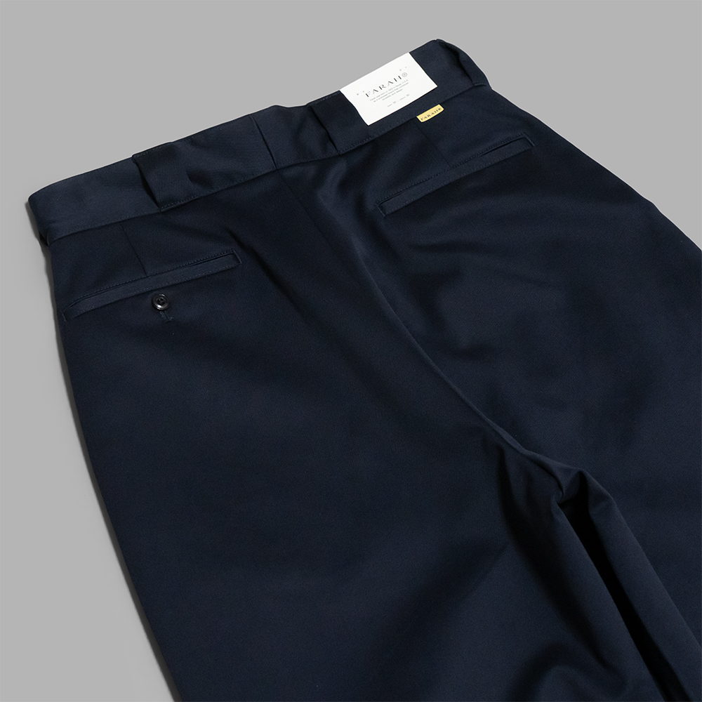 型は70年代のワークパンツをベースにほどよいゆとりを持たせて、綺麗なシルエットが出るように設計されたストレートパンツです。ポケットはブランドアイコンのL字型ポケットを縦向きに付けており、前立てはジップフライの仕様で作られています。