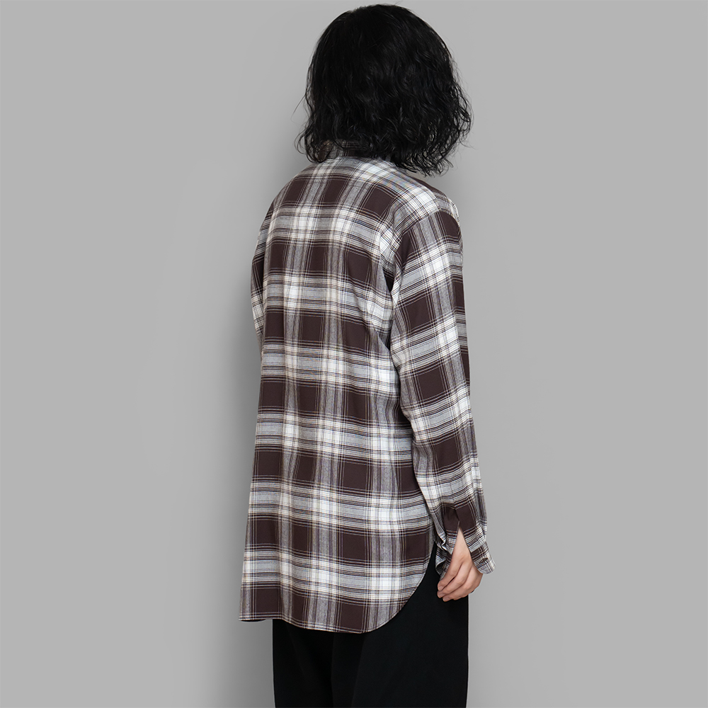 ブランドで定番として展開しているシャツ型に、前見頃にポケットを配置し、よりデイリーな仕様に変更したレギュラーカラーシャツです。構造は、アクションプリーツ・ヨークのないシンプルな後ろ身頃ながら、アームホールのカービングをきつくすることにより、十分な可動域を確保しています。サイズ感も適度にゆとりをもたせています。