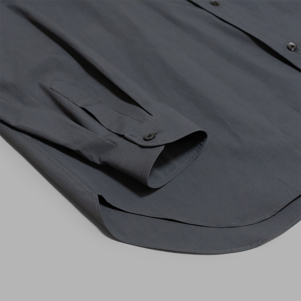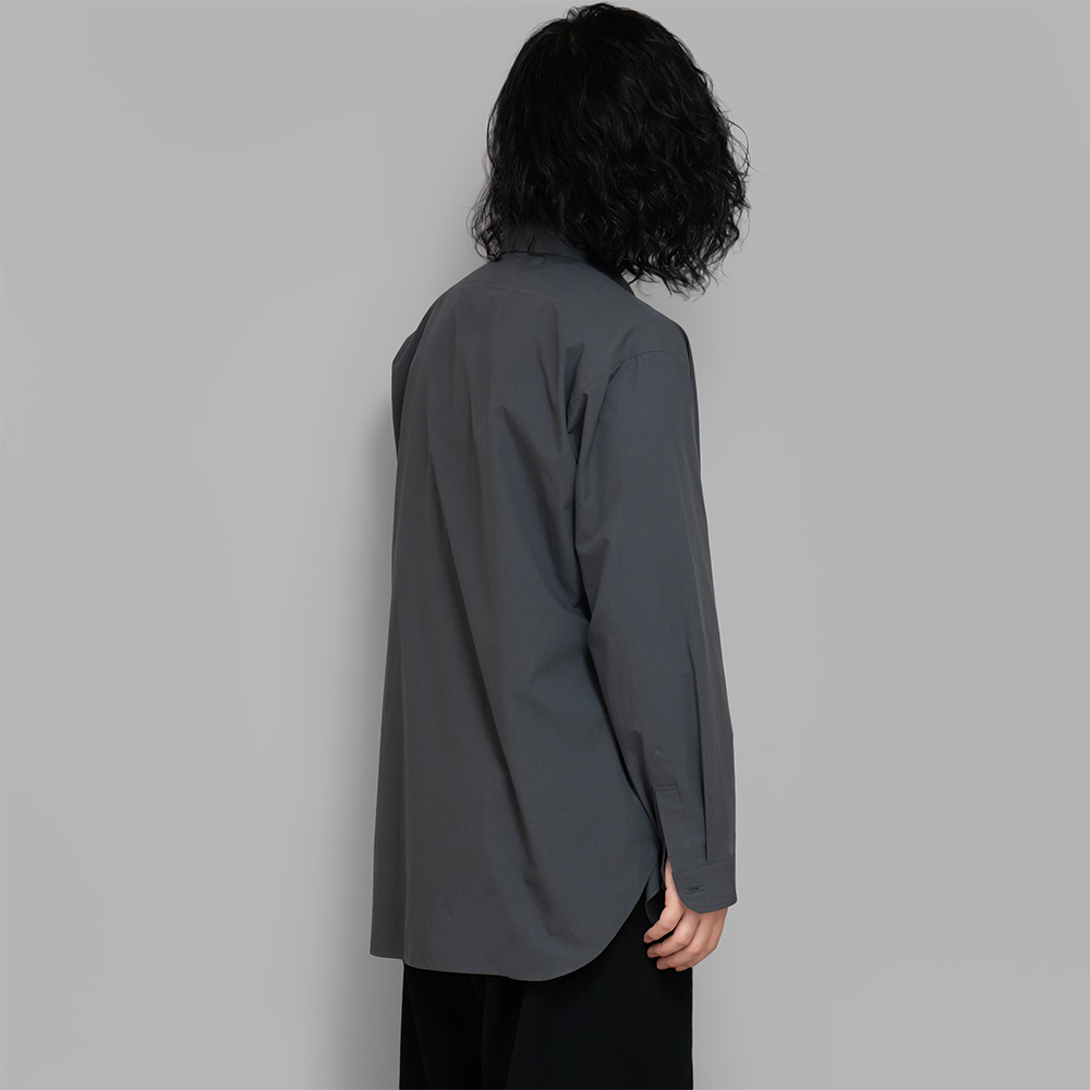ブランドで定番として展開しているシャツ型に、前見頃にポケットを配置し、よりデイリーな仕様に変更したレギュラーカラーシャツです。構造は、アクションプリーツ・ヨークのないシンプルな後ろ身頃ながら、アームホールのカービングをきつくすることにより、十分な可動域を確保しています。サイズ感も適度にゆとりをもたせています。