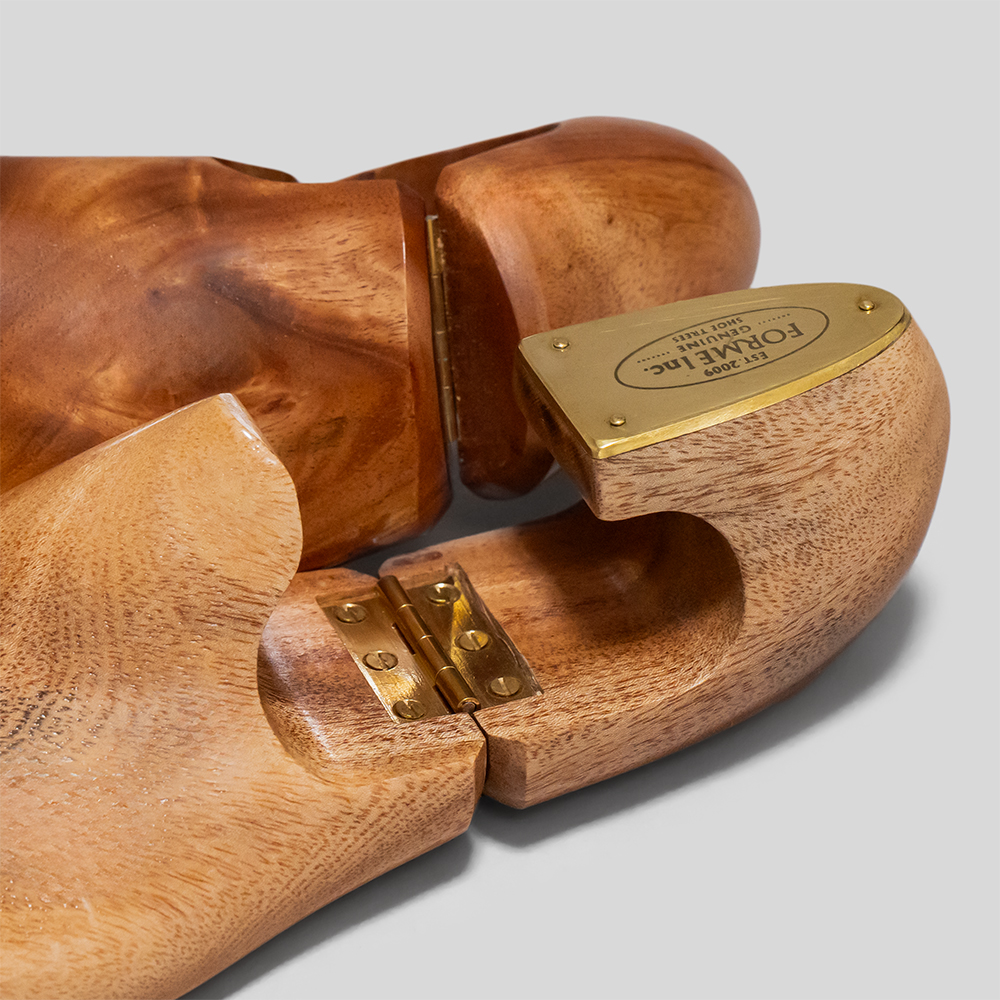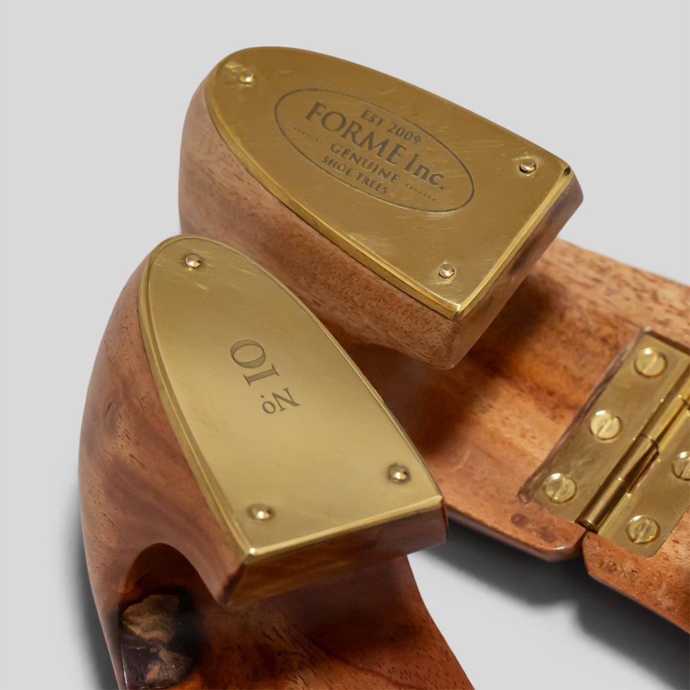 formeの木型No.10を使用し製作されてる革靴専用の純正シューツリーです。木材には高級家具にも使用され、木目が美しいアフリカンマホガニーを採用しています。プレート部には、真鍮の無垢材を使用し、サイドをフラットになるよう削り上げることで金属と木材の一体感を生んでいます。仕上げの加工を施さない無垢材を使用しているので、光沢がかすみ、色も深く変化する過程も楽しめます。
